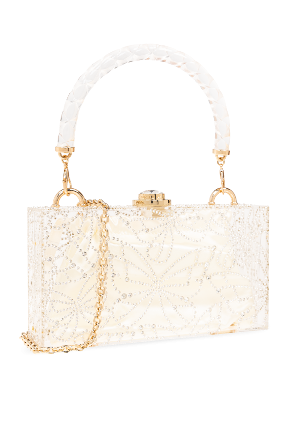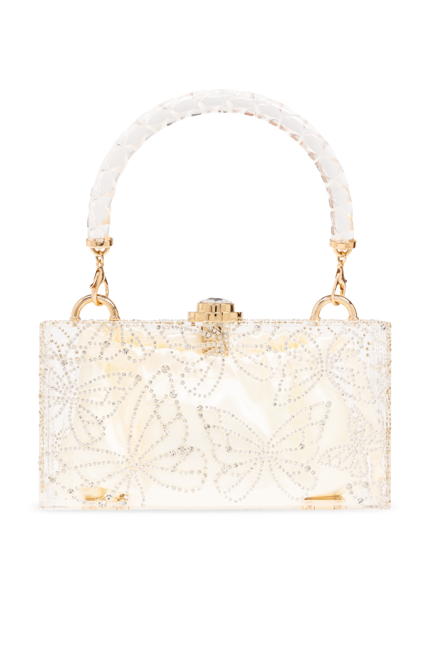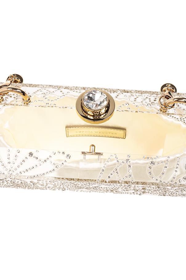 Introducing the Cleo Clutch by Sophia Webster, an epitome of elegance and a beacon of luxury in the realm of exclusive fashion accessories. Crafted with meticulous attention to detail, this exquisite evening bag is a testament to timeless beauty and sophistication. The Cleo boasts a rectangular silhouette with clean, sharp lines, enveloped in a pristine white acrylic body. Its surface is adorned with a delicate, decorative pattern resembling flower petals or snowflakes, further illuminated by sparkling embellishments. These glistening crystals, meticulously placed across the clutch, infuse it with a rich, refined aura. Noteworthy features include a single white, padded handle and the option of a long, slender, golden chain for shoulder wear, both adding a touch of versatility and functional elegance. The clutch\'s closure is uniquely captivating, consisting of a large, round, shining stone set on a golden base, ensuring your belongings are secured with a flourish of exclusivity. Subtle yet significant, the presence of a gold bar possibly bearing the designer\'s logo, along with gold metal elements, accentuates its luxurious character. Inside, a compartment with a satin pouch, secured by drawstrings, elegantly houses your essentials. Why Purchase This Product? Unparalleled Elegance: Perfect for enhancing evening attire, the Cleo Clutch adds a touch of sophistication and refinement. Exquisite Craftsmanship: Made from high-quality acrylic, metal, and crystals, ensuring durability and a luxurious feel. Designer Prestige: A creation of Sophia Webster, known for her unique and elegant designs. Eye-Catching Detail: Embellished with a characteristic butterfly motif, set with shimmering crystals, it\'s designed to captivate and charm.