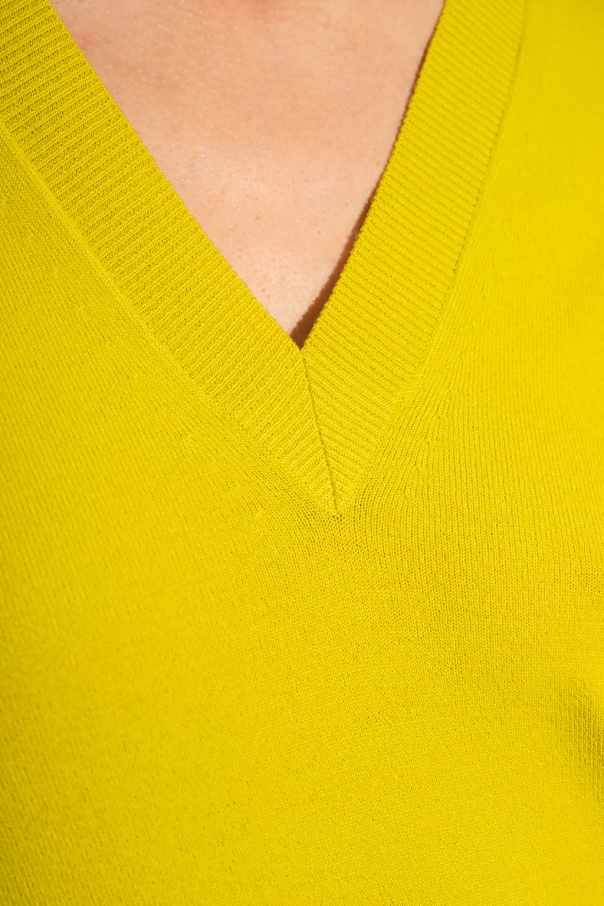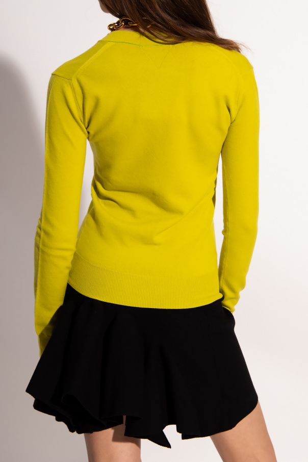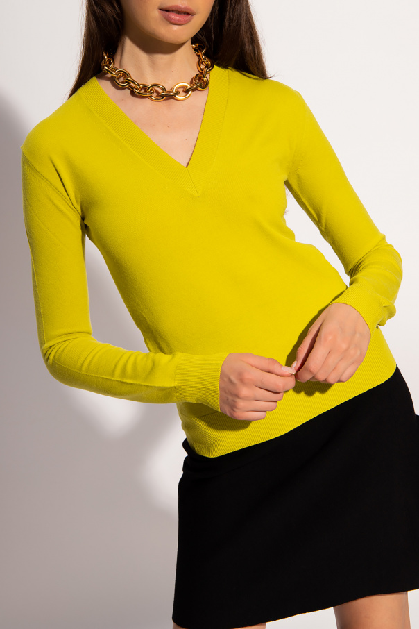 Green V-neck sweater from Bottega Veneta. Crafted from wool, this style showcases dark green stitching on the neck and ribbed trims on the collar, bottom hem and cuffs.