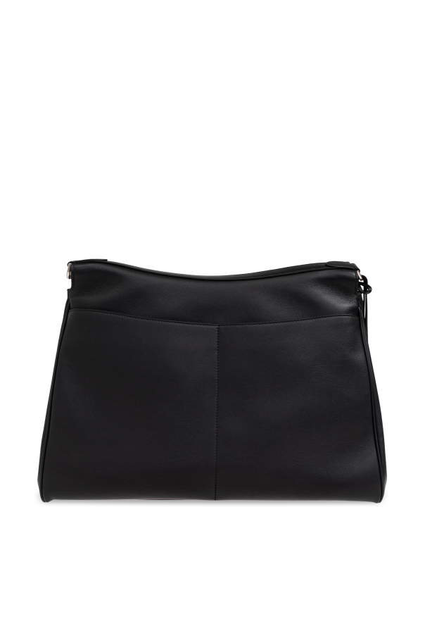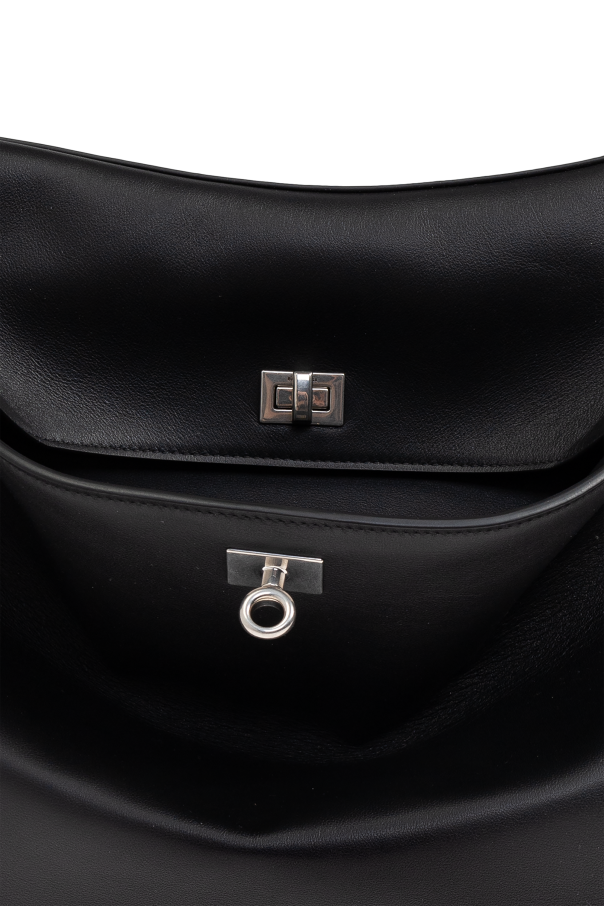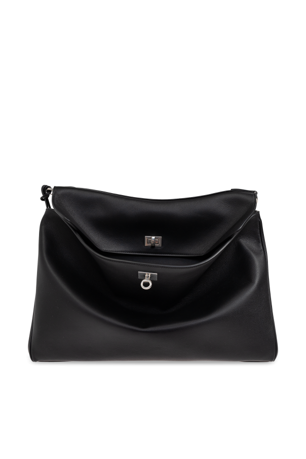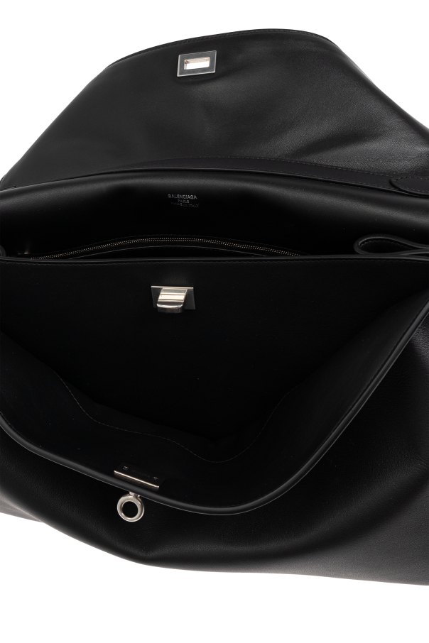 Introducing the Rodeo Leather Bag by Balenciaga, a paragon of modern elegance crafted from the finest calfskin leather. This exquisite handbag boasts a contemporary minimalist design with a distinctive rectangular shape, subtly rounded at the front to enhance its sophisticated allure. Encased in a universal black hue, this bag radiates versatility, making it an impeccable choice for various ensembles. The front features a sleek metallic clasp with a unique swivel mechanism, ensuring both security and style. Additional silver-toned hardware, including clasps and fittings, accentuates its elegant aesthetic. Inside, the spacious interior is thoughtfully designed with dual compartments and a zippered pocket, offering practicality for daily use. A discreet inner logo confirms its authenticity, while the included strap allows for comfortable shoulder wear. Why Choose This Product? Timeless design by renowned fashion house Balenciaga. Luxurious calfskin leather for unmatched quality. Spacious and functional with two compartments and a zippered pocket. Versatile black color complements any wardrobe. Elegant silver-toned hardware for a refined finish.