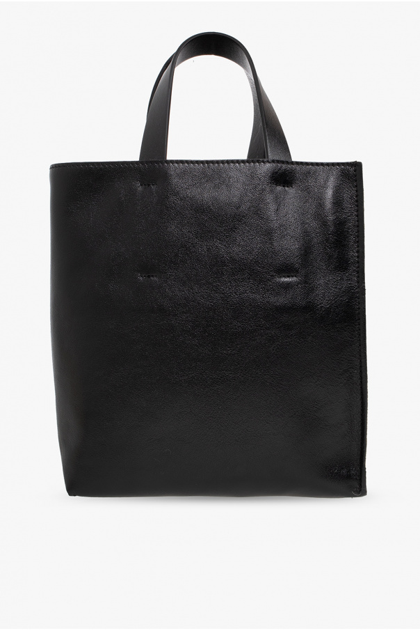 Black shoulder bag from Marni. Crafted from calf leather, this design showcases white lamb fur trim and black logo embroidery on the front, two half-round handles, a detachable and adjustable shoulder strap, gold-tone metal hardware and one zip pocket inside.