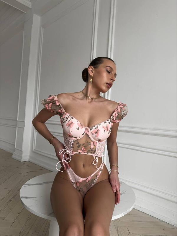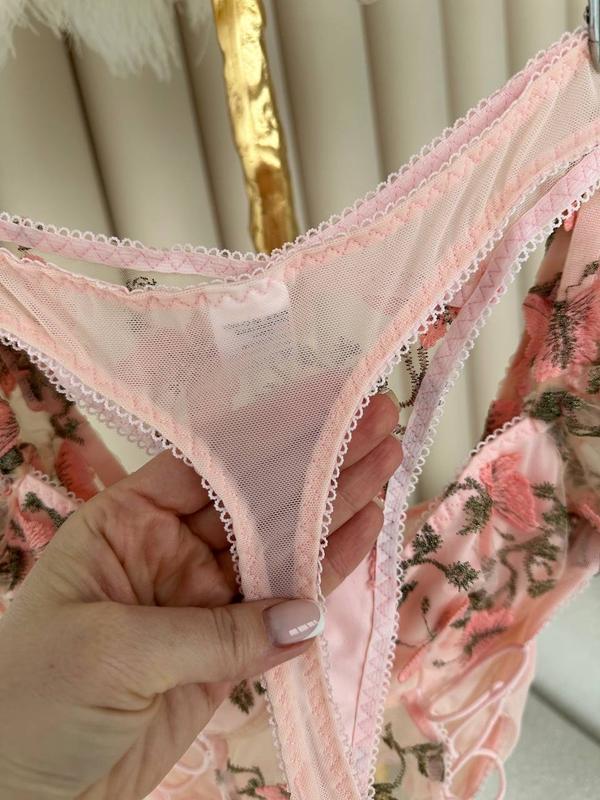 Матеріал:Поліестер , Еластан ,Модель трусиків:Стринги ,Чашка:На кісточках , Без Push-up ,Форма бюстгальтера:Бюстгальтери - топи ,Посадка:Висока ,Декор:Вишивка , Сіточка ,Вид комплекту:З топом ,Принт:Квітковий , - Shipping