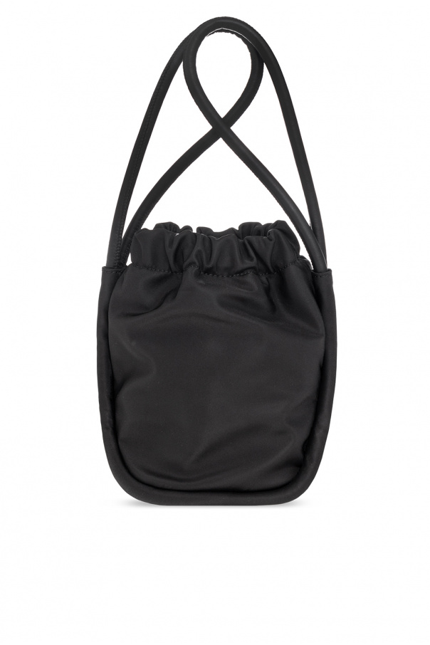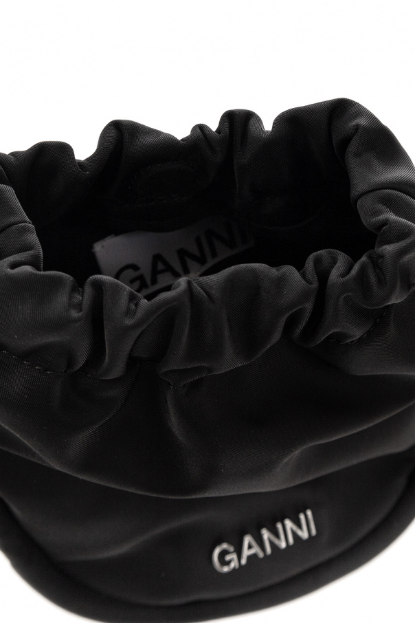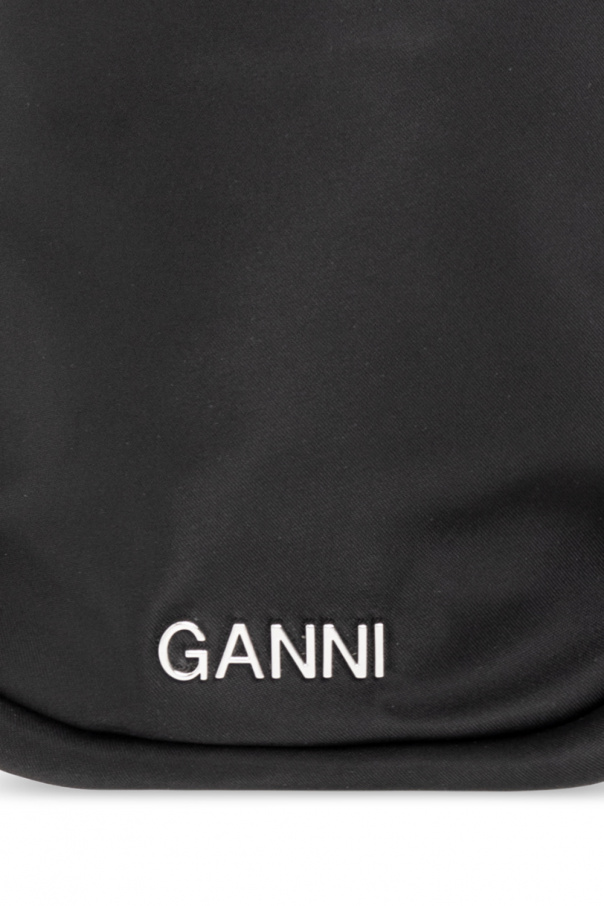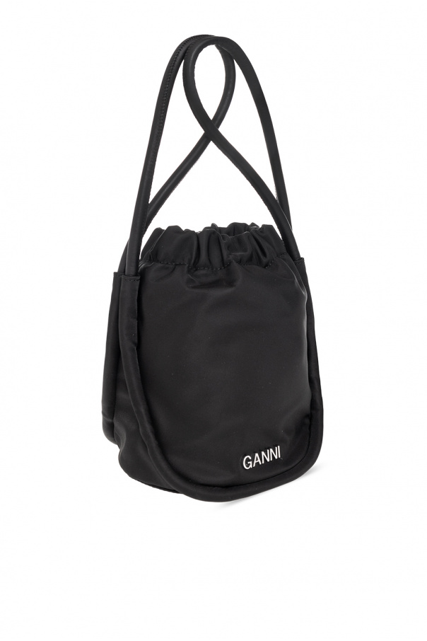 Black handbag from Ganni. Crafted partially from recycled material, this design secures with a magnetic fastener and features an elastic trim, a silver-tone logo application on the front, two leather handles, silver-tone metal hardware and one internal compartment.