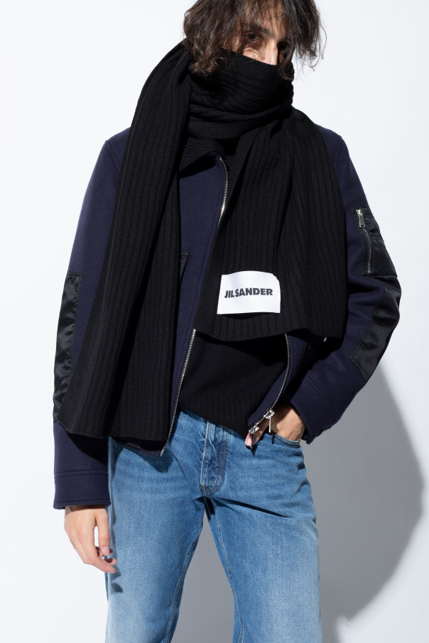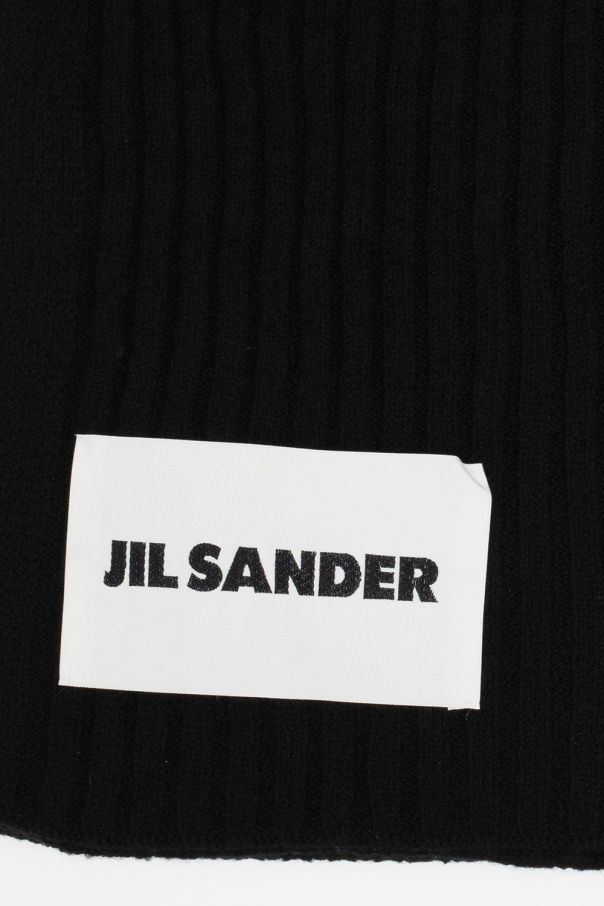 Black scarf from Jil Sander. Crafted from wool with ribbed detailing, this item features a white patch with a black logo.