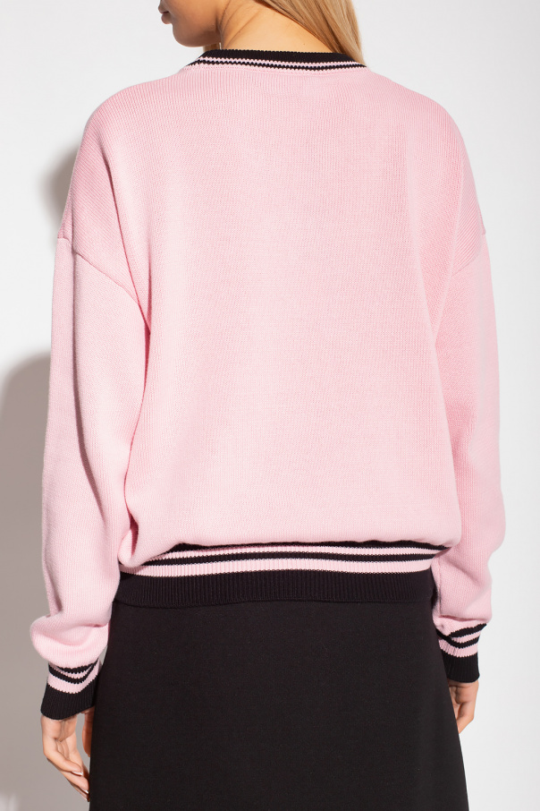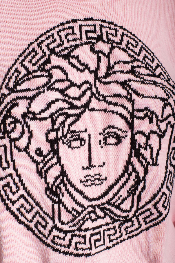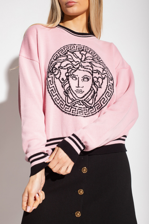 Light pink sweater from Versace. Made of cotton, this garment is decorated with the label’s signature Medusa head embroidery in black and ribbed trims at the crew neck, hem and cuffs.