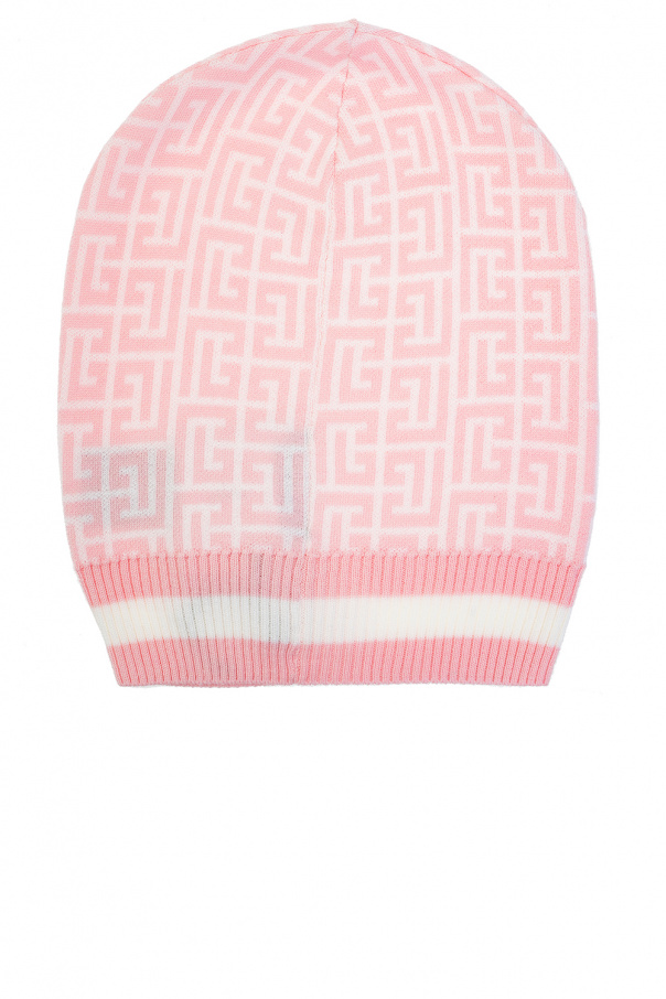Pink and white hat from Balmain. Knitted from wool, this item showcases an embroidered logo.