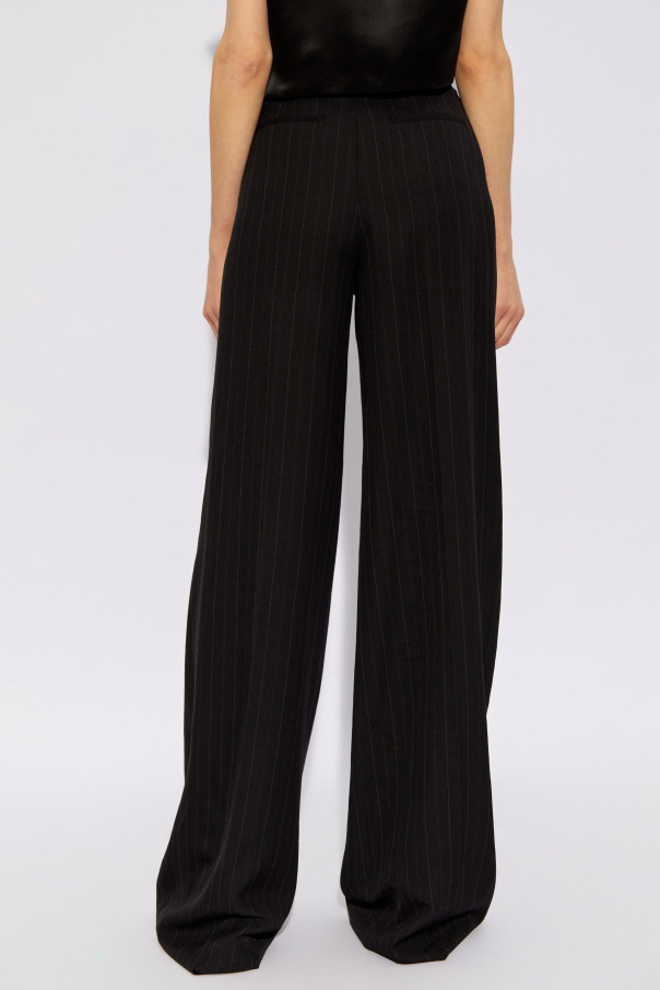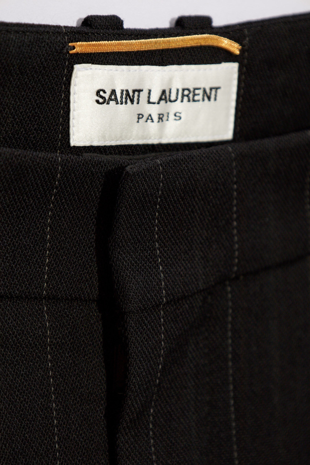 Introducing the epitome of sartorial elegance, the Saint Laurent Striped High-Waisted Trousers. Crafted from a luxurious blend of 76% wool and 22% viscose, these trousers offer a smooth and flowing silhouette that combines comfort with unparalleled style. The dominant black hue, accented by light vertical stripes, not only enhances the garment\'s sophistication but also offers an optical slimming effect, elongating the legs in a manner that is both flattering and graceful. The trousers boast a high-waisted design, meticulously tailored to accentuate the natural waistline, while the straight to slightly flared leg cut harks back to the palazzo or wide-leg style, ensuring a timeless appeal. Fastened with a zip, hook, and button closure, and detailed with precise front darts, these trousers provide both a snug fit and ease of movement. The presence of four pockets, two frontal and two at the back, adds a practical element to this exquisite piece. The inclusion of the \"SAINT LAURENT PARIS\" label, set against a white background with black letters and highlighted by a gold line, signifies the trousers\' origin from a house of high fashion renown, adding a touch of luxury to an already distinguished garment. Why Purchase This Product? Elegant and classic design, perfect for various occasions. Made from high-quality materials, ensuring durability and comfort. Optical slimming effect, thanks to the vertical stripe pattern. Features practical details such as four pockets and precise front darts. Embellished with the prestigious Saint Laurent Paris label, symbolizing luxury and exclusivity.