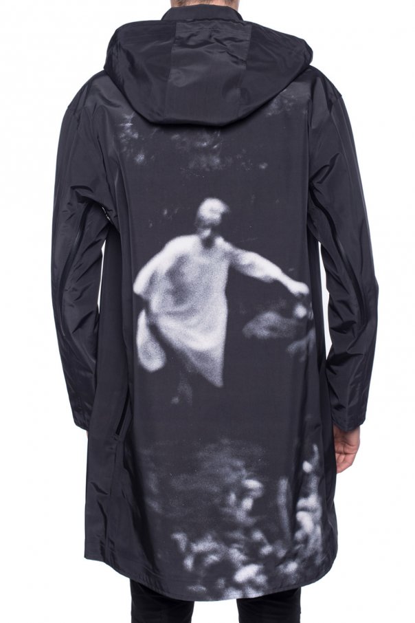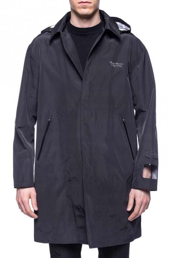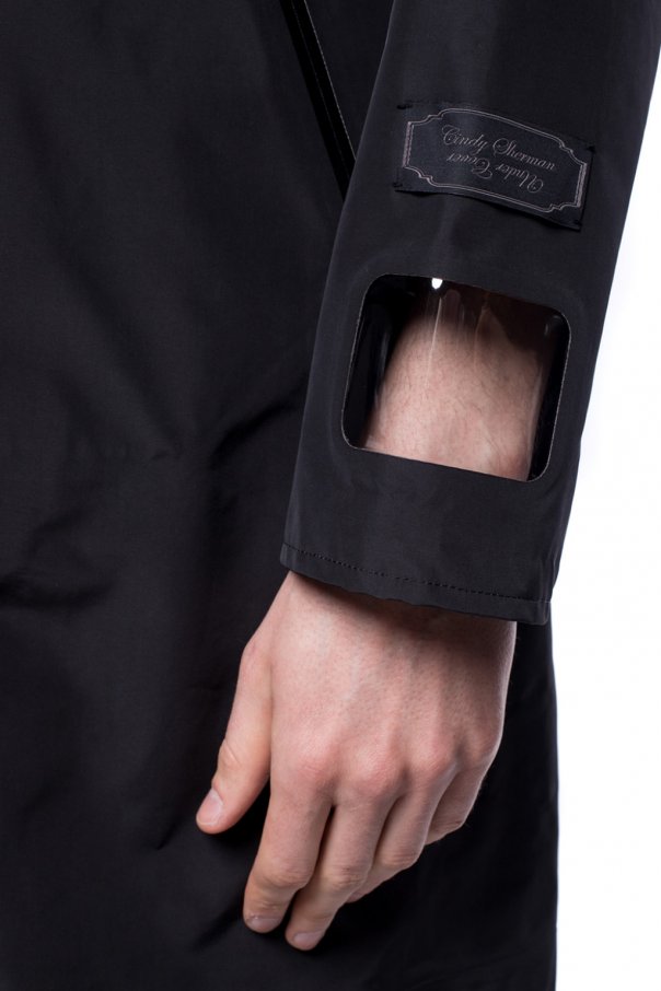 Black coat from Undercover. Fastened with buttons. Decorated with embroidered lettering. Two zip pockets on the front. Print at the back.