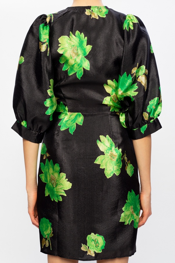 Black wrap dress from Samsoe Samsoe. Illustrated with a colourful floral print, this garment features short length with V-shaped neckline, puff sleeves and a self-tie belt at the waist.