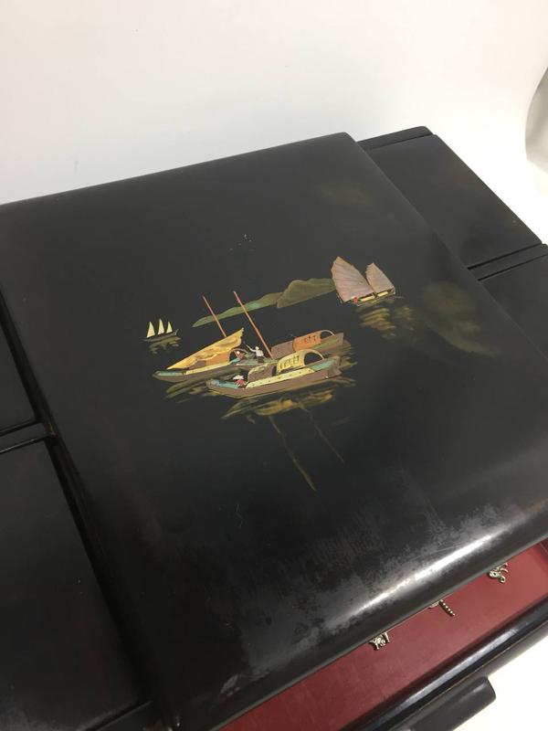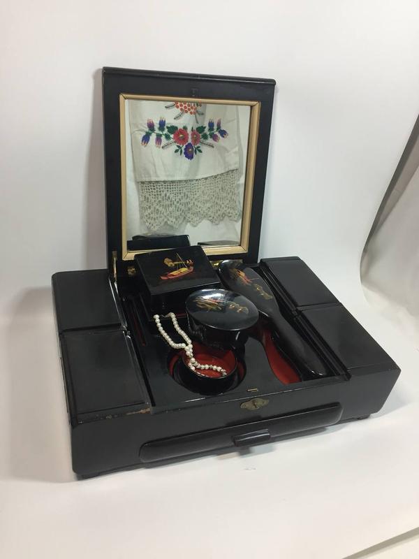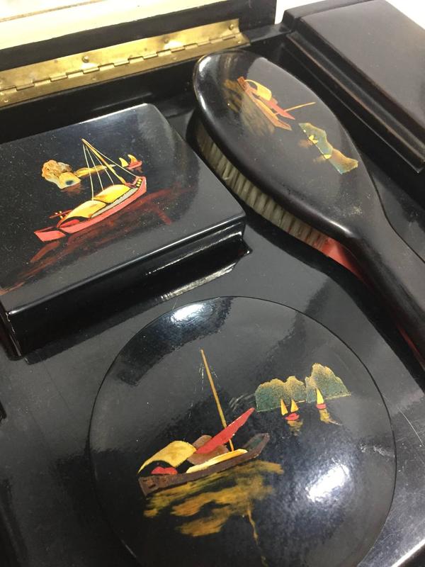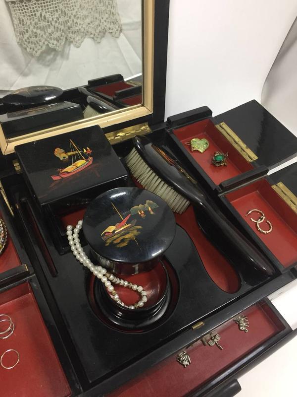 Шкатулка с зеркалом на 6 отделов, для украшений и косметики, 2-е шкатулки и мягкая щетка лак, ручная роспись, старый Китай, туалетный набор 1950-х годов Н2000