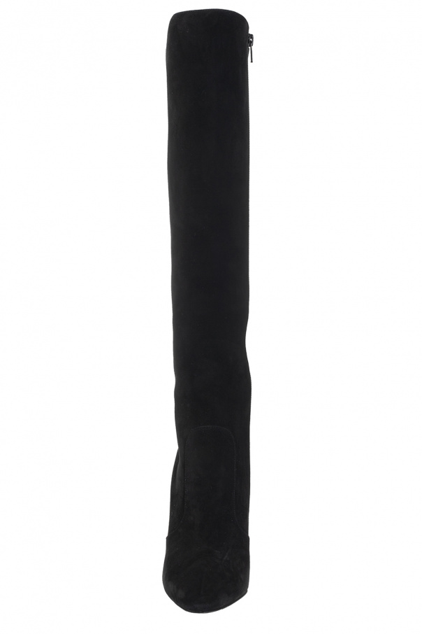 Black ‘68’ heeled knee-high boots from Saint Laurent. Crafted from suede, this model sits on a black leather sole and showcases a pointed toe silhouette and a side zip fastening.
