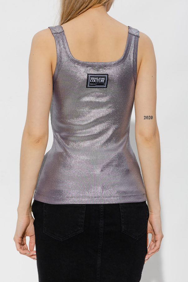Silver-tone top from Versace Jeans Couture. Crafted from ribbed fabric with metallic coating, this style features a form-fitting silhouette with adjustable shoulder straps and signature baroque buckles in gold-tone.
