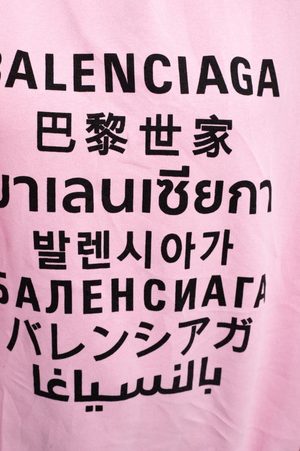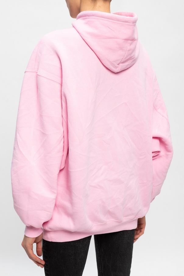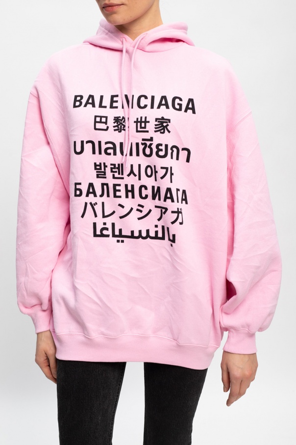 Light pink hoodie from Balenciaga. Made of cotton, this oversize design features a drawstring hood, creased effect, black logo print and ribbed trims at the hem and cuffs.