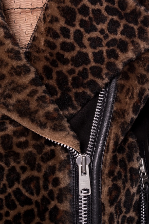 Black 'Elia' biker jacket from AllSaints. Made of sheepskin and lamb leather. Fastened via zip. Embellished with brown and black leopard-printed shearling. Features 2 zip pockets with fringes on the front, wide side tabs and padded black lining.