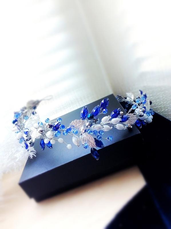 Нова авторська робота, плетена гілочка - віночок в синьо-білих відтінках з використанням штучних перлинок (форма ягідки), кришталевих намистин, сріблястого металевого декору у формі листка з прожилками, кристалів сапфірово-синього кольору і біжутерного мідного дроту зі сталево-сріблястим покриттям