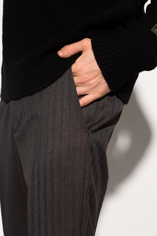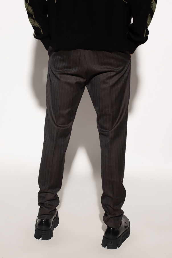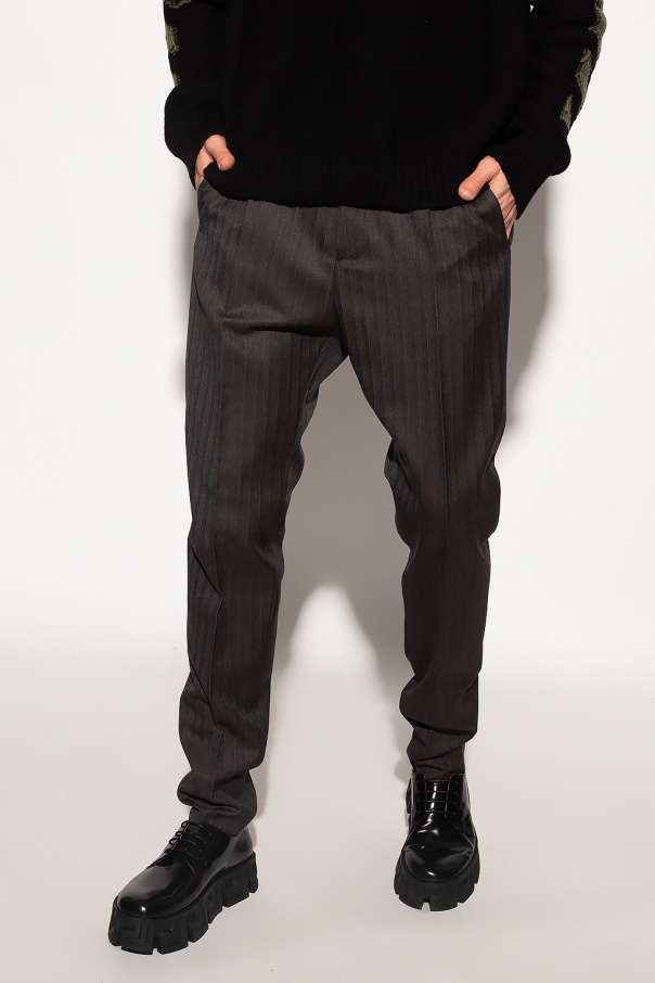 Grey ‘Los Angeles Fit’ trousers from Dsquared2. Distinguished by blue pinstripes, this pair falls down with slightly tapered legs and features a zip fly with a hook and button, pleat detailing, two front slip pockets and two back button pockets.