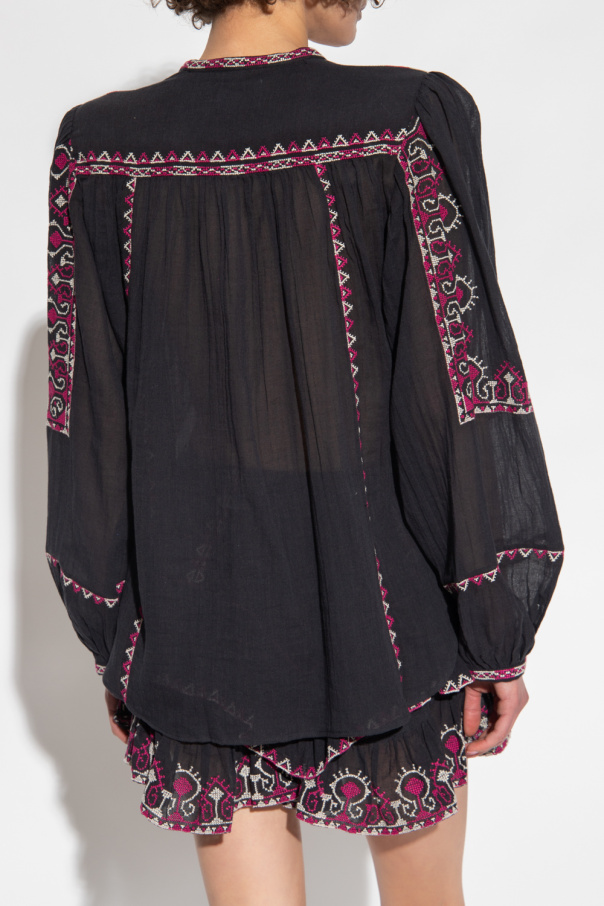 Navy blue, pink and white ‘Kiledia’ top from Marant Etoile. Made of cotton, this style showcases a tie neckline, oriental embroidery and puff sleeves with elasticated cuffs.