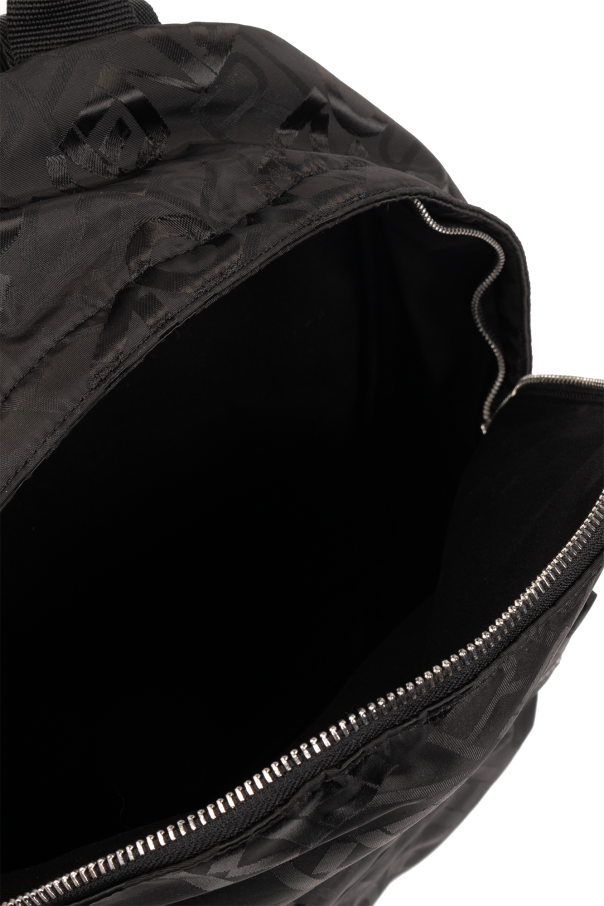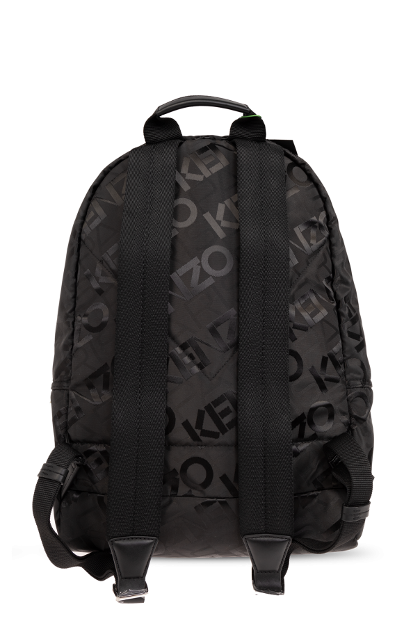 Black ‘Kenzo Paris’ backpack from Kenzo. Embellished with a logo pattern, this design fastens via a two-way zip and features one zip pocket on the front, one top handle, adjustable shoulder straps, silver-tone metal hardware and one internal compartment with one slip pocket.