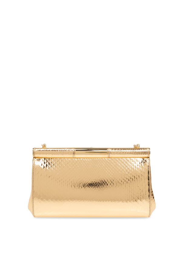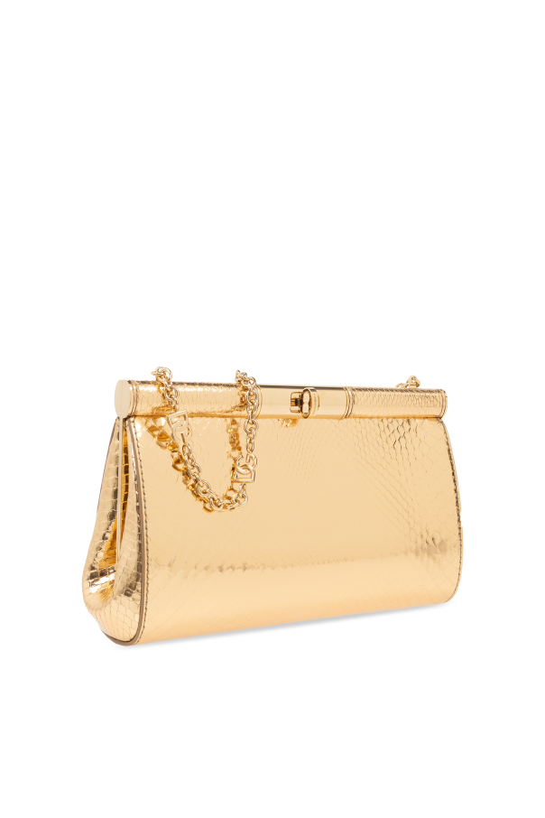 Introducing the ‘Marlene Medium’ Clutch by Dolce & Gabbana, an epitome of luxury and sophistication for the discerning fashion enthusiast. This exclusive piece, crafted from the finest 100% Python molurus exterior, boasts a mesmerizing golden hue that radiates elegance and a high-end appeal. The clutch\'s surface is adorned with a subtle snake skin pattern, enhancing its texture and depth, while the metallic finish adds a touch of glamour. The clutch is complemented by a gold chain with substantial links, serving as a chic shoulder strap and adding a distinctive design accent. Its medium size makes it an ideal companion for evening outings or special events, perfectly balancing functionality and style. The interior, lined with 100% lamb leather in a soft beige, is thoughtfully designed with a compartment and a slip pocket, secured with a \'twist\' closure featuring an engraved logo, showcasing the meticulous attention to detail and craftsmanship. The inclusion of a metallic logo plate inside reaffirms its status as a luxury accessory, making the ‘Marlene Medium’ clutch a must-have for those who appreciate the allure of high fashion and the legacy of Dolce & Gabbana. Why Purchase This Product? Elegant gold finish and snake skin pattern for a luxurious aesthetic. Exquisite craftsmanship with premium Python molurus and lamb leather materials. Versatile gold chain strap, enhancing its sophisticated design. Perfect size for evening wear with an organized interior for essentials. Signature Dolce & Gabbana quality and design, symbolizing fashion excellence.