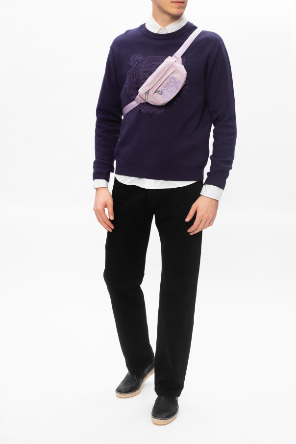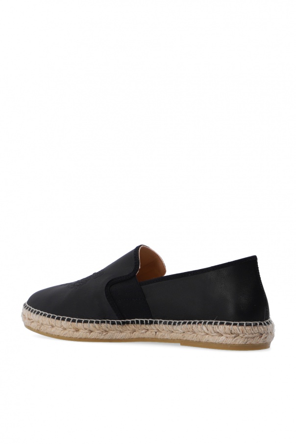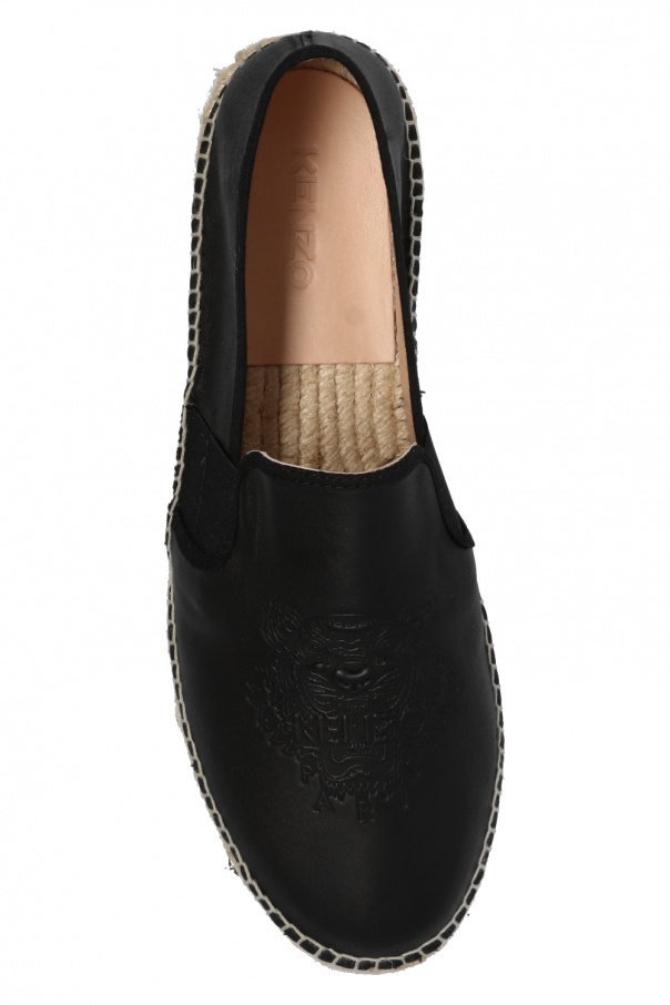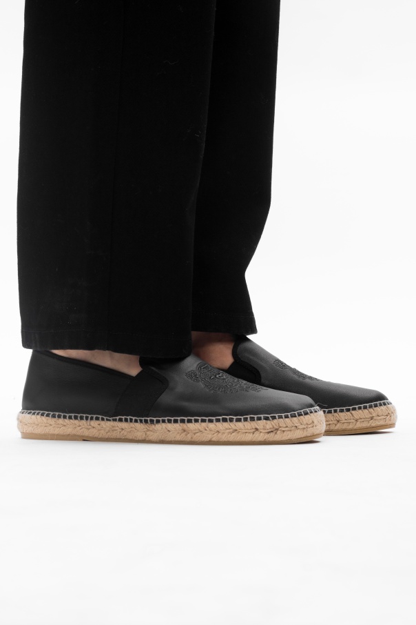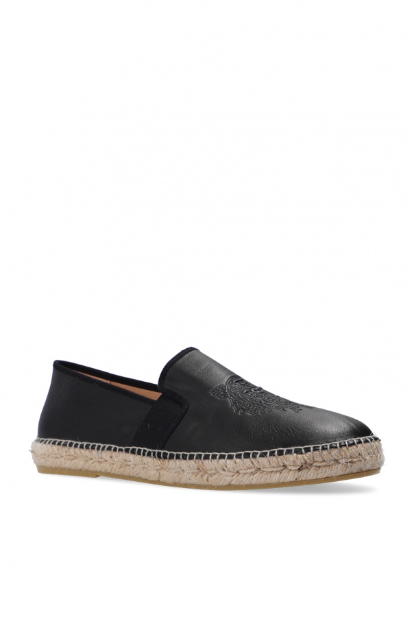 Black espadrilles from Kenzo. Crafted from leather, this design features an embossed logo, elastic panels on the sides and a beige rubber sole with decorative trims.