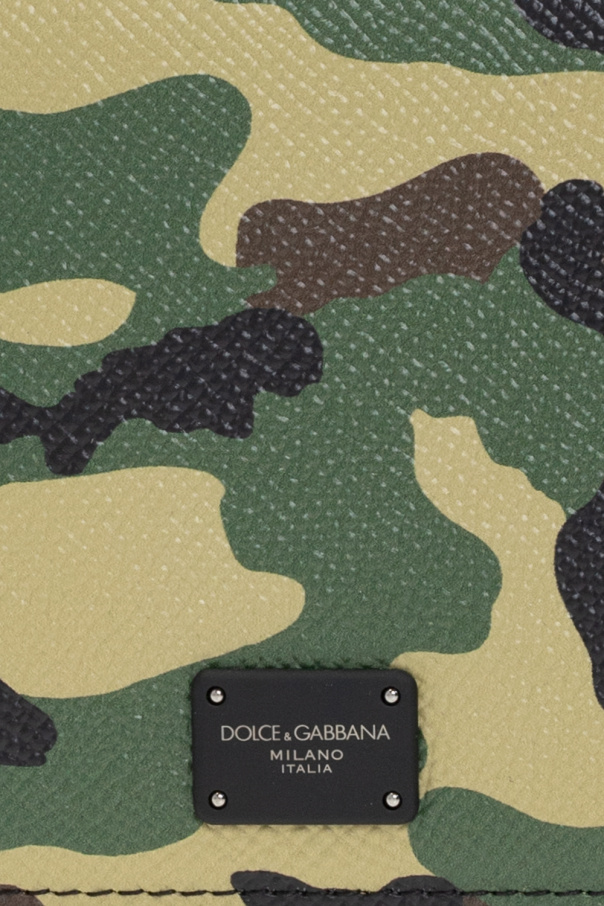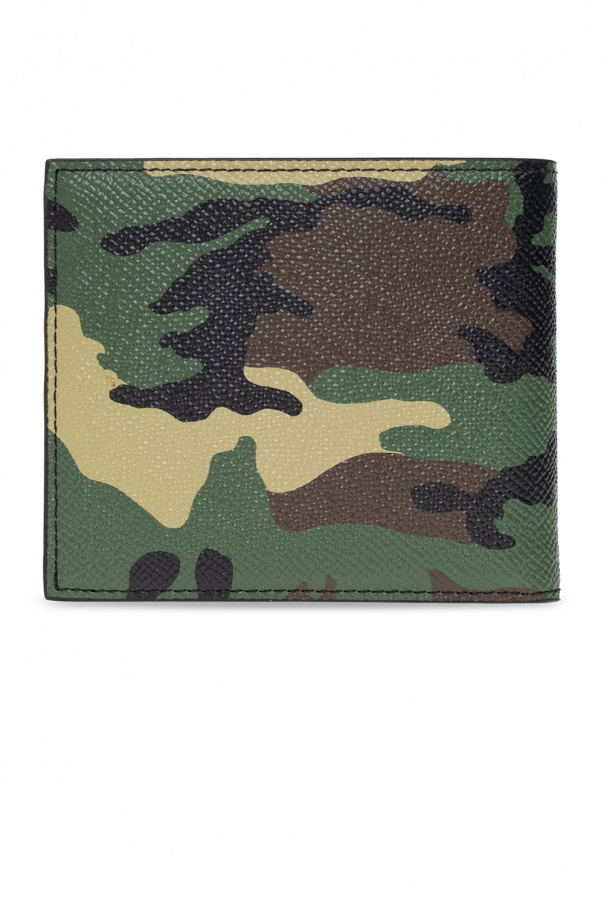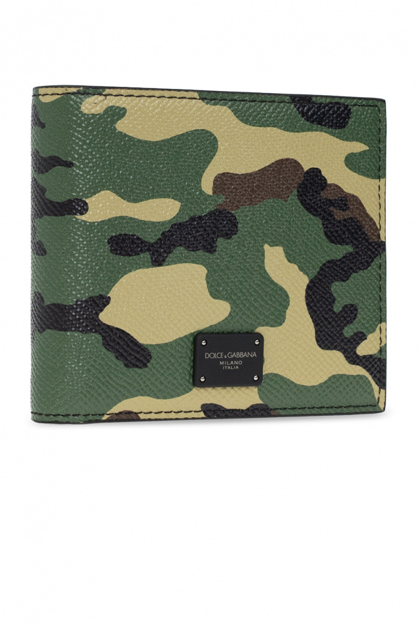 Green, brown and black bifold wallet from Dolce & Gabbana. Made of grained Dauphine calf leather, this item features with a camo pattern and black logo appliqué. It has a bill compartment, two slip pockets and six card slots.