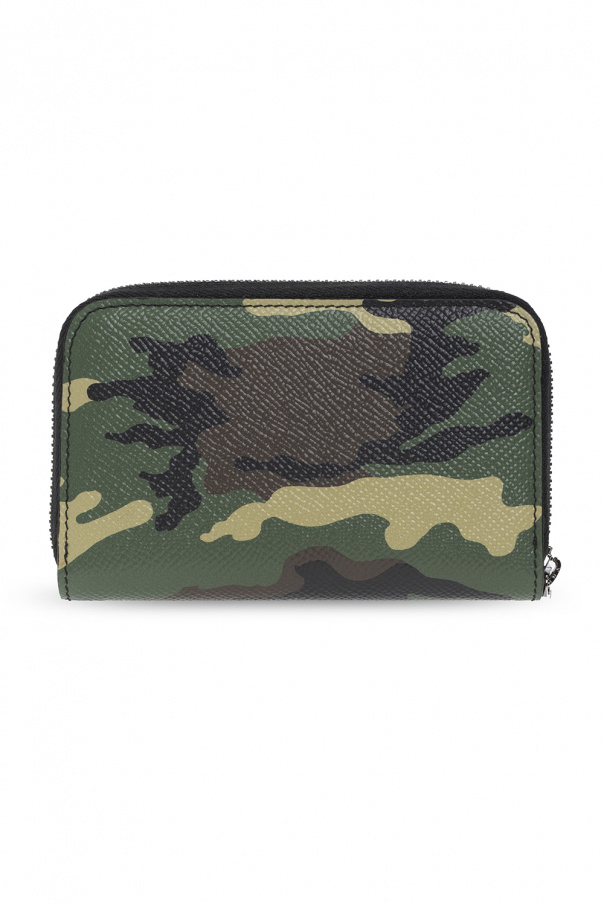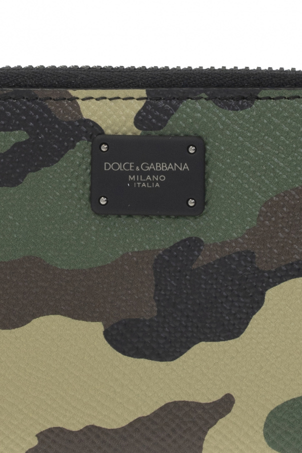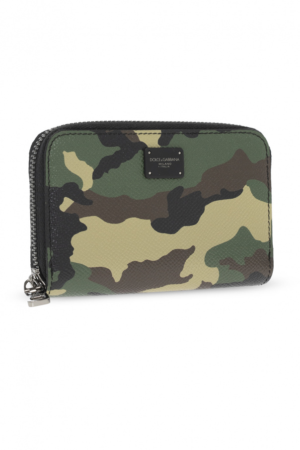 Green, brown and black bifold wallet from Dolce & Gabbana. Made of grained Dauphine calf leather, this item features with a zip fastening, camo pattern, black logo appliqué and one internal compartment with three card slots.