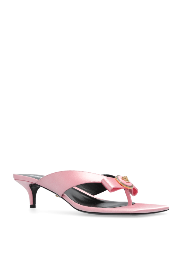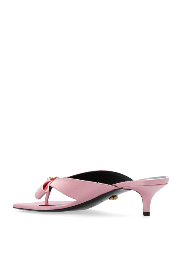 Pink mules from Versace. Rendered in satin with a square toe, this model sits on a black leather sole and features a decorative bow and gold-tone and black hardware with the brand\'s signature Medusa face and Greca motif on the front.