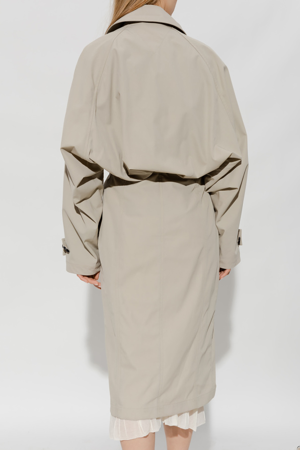 Greyish beige trench coat from Bottega Veneta. Crafted with a double-breasted silhouette, this style features a waist-cinching belt, button fastenings, two slip pockets and long sleeves.