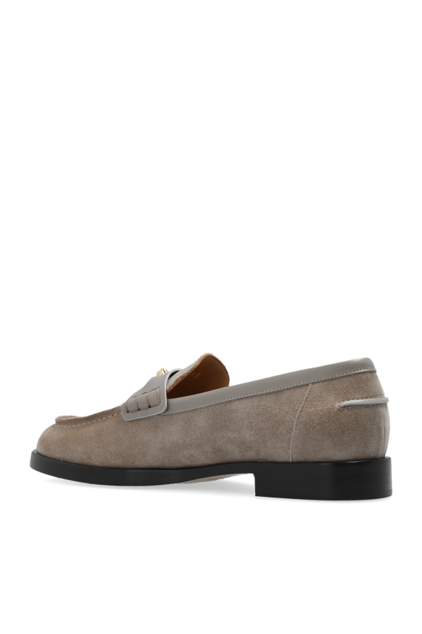 Greyish brown loafers from Emporio Armani. Made of suede, this pair features a strap with a logo detail in gold-tone and leather sole in black and beige.