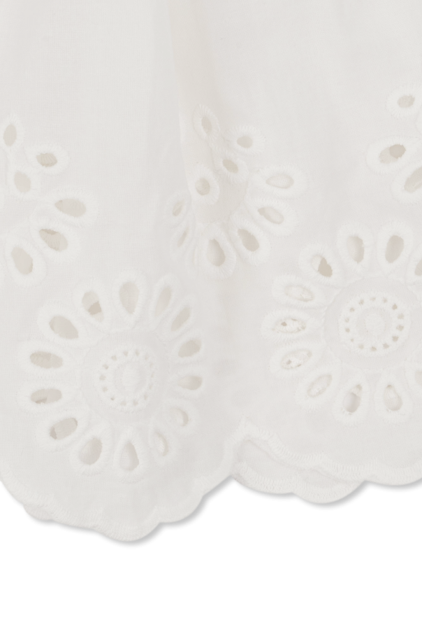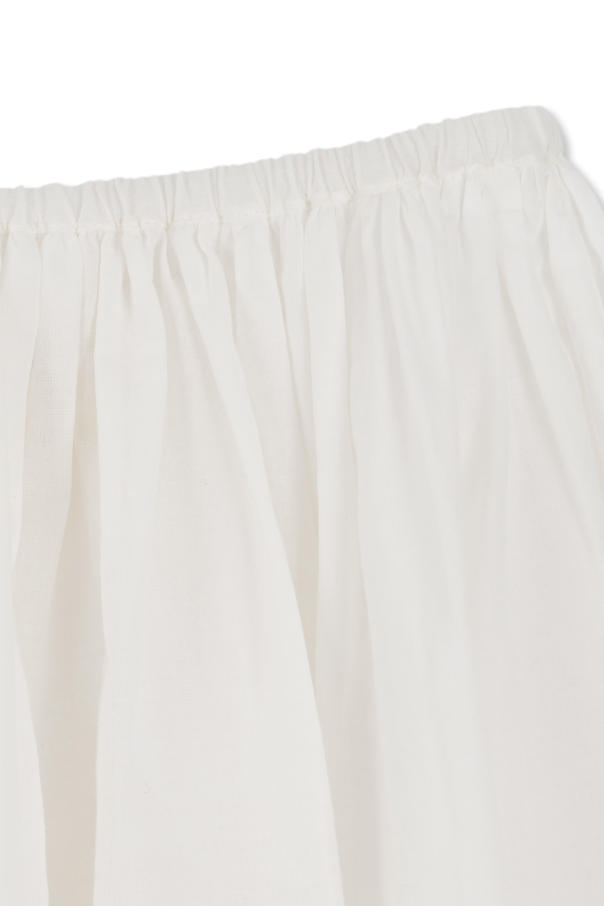 Introducing the \"Posey\" skirt by Konges Sløjd, a masterpiece of design that combines elegance with comfort. This exquisite piece is crafted from 100% organic cotton, affirming both a commitment to sustainability and a soft, breathable wearing experience. The skirt\'s dominant pristine white color exudes purity and versatility, making it a quintessential addition to any wardrobe. The \"Posey\" skirt is adorned with intricate English embroidery, featuring ornamental cut-out patterns that are symmetrically distributed along its length, with a particular emphasis towards the hem. This detailing adds a touch of sophistication and timeless charm. Its flared silhouette, accentuated by a gently gathered waist, offers a flattering fit that promises to enhance your figure while ensuring freedom of movement. The skirt’s above-the-knee length further contributes to its youthful and spirited allure. Designed as part of a versatile collection, the \"Posey\" skirt can effortlessly be paired with various garments to create a cohesive ensemble. Its button or zip closure (not visible in the images provided) ensures ease of wear, blending functionality with style. Why Purchase the \"Posey\" Skirt? Eco-friendly Material: Made from 100% organic cotton, promoting environmental sustainability. Exquisite Craftsmanship: Features delicate English embroidery with cut-out patterns for an elegant flair. Flattering Fit: The flared silhouette and gathered waist create a flattering shape for all body types. Versatile Style: Its pristine white color and timeless design ensure easy pairing with a multitude of tops and accessories.