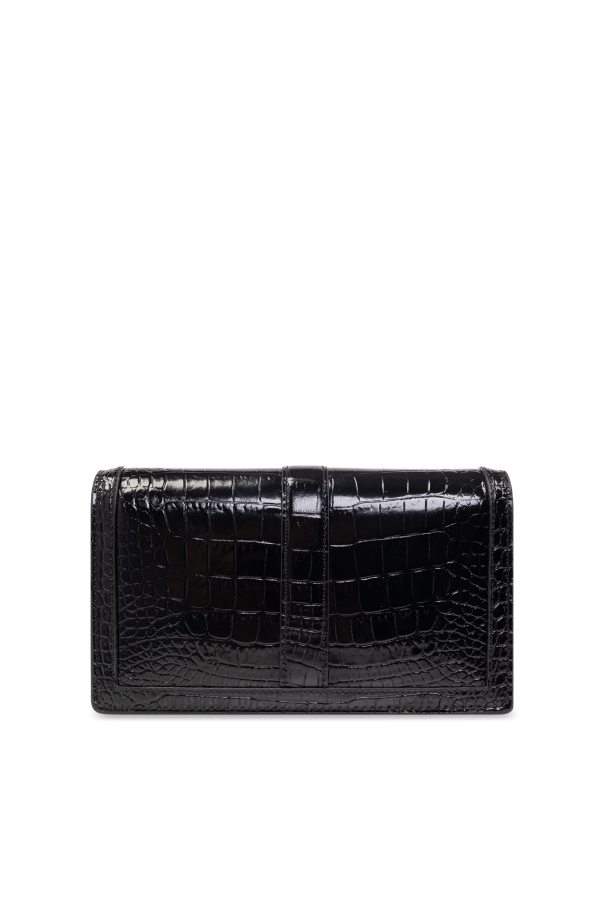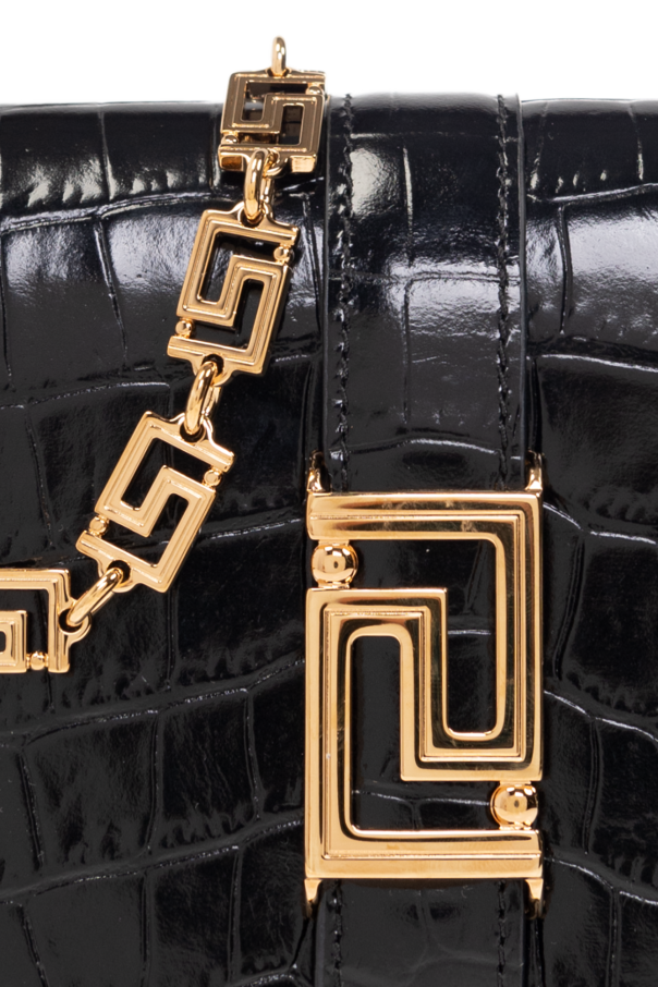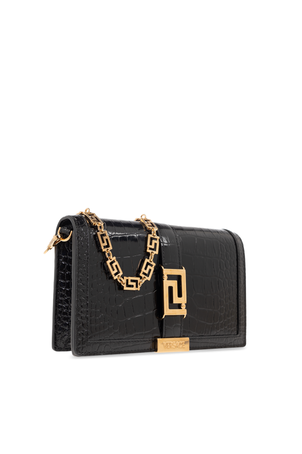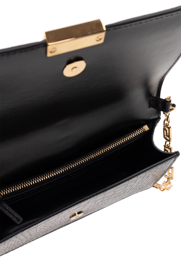 Black shoulder wallet from Versace. Made of calf leather, this design secures with a magnetic fastener and showcases a logo application. It is complete with a chain shoulder strap, silver-tone metal hardware and one internal compartment with eight card slots and two slip pockets.
