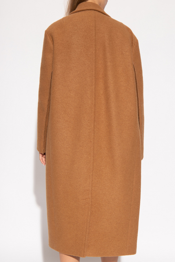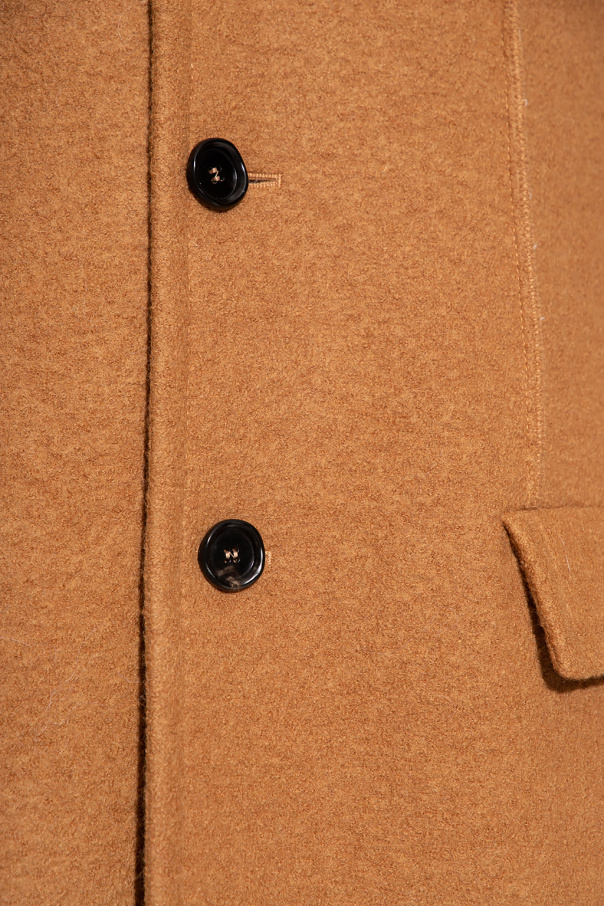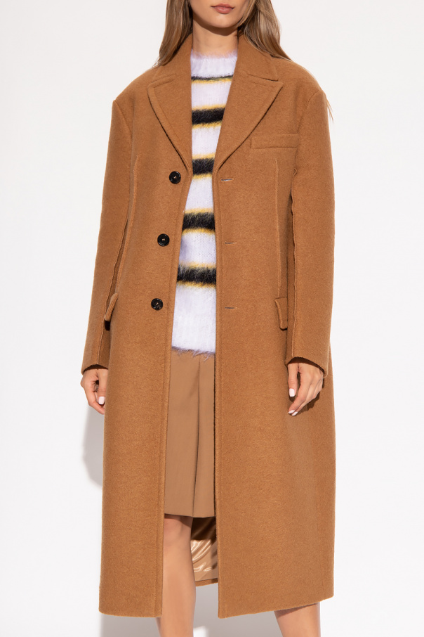 Light brown coat from Marni. Made from wool with a single-breasted, oversize silhouette, this style features button fastenings, a lapel collar, one slip pocket, two flapped pockets, decorative trims and a single back vent.