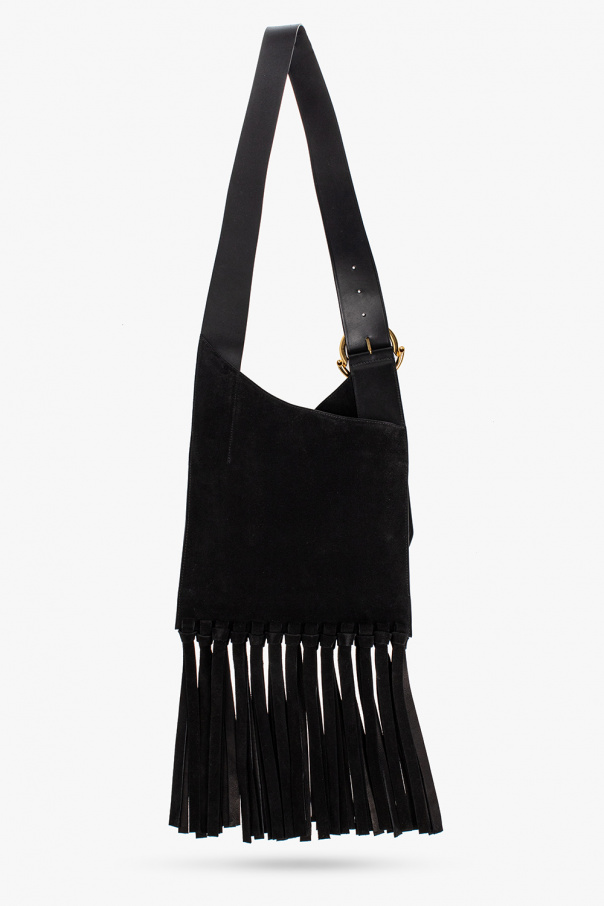 Black shoulder bag from Etro. Made of calf suede with leather trims, this model features a magnetic closure, embossed logo, long fringes, adjustable shoulder strap with a metal gold-tone buckle and one internal compartment with one zip pocket.