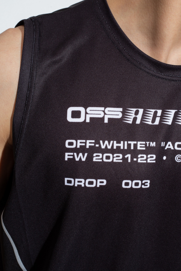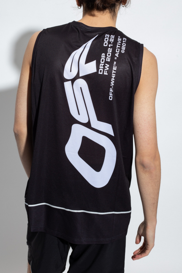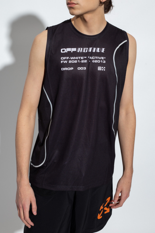 Black crewneck sleeveless T-shirt from Off-White, the ‘Active’ line. Spun from synthetic yarns, this style features an elasticated collar.