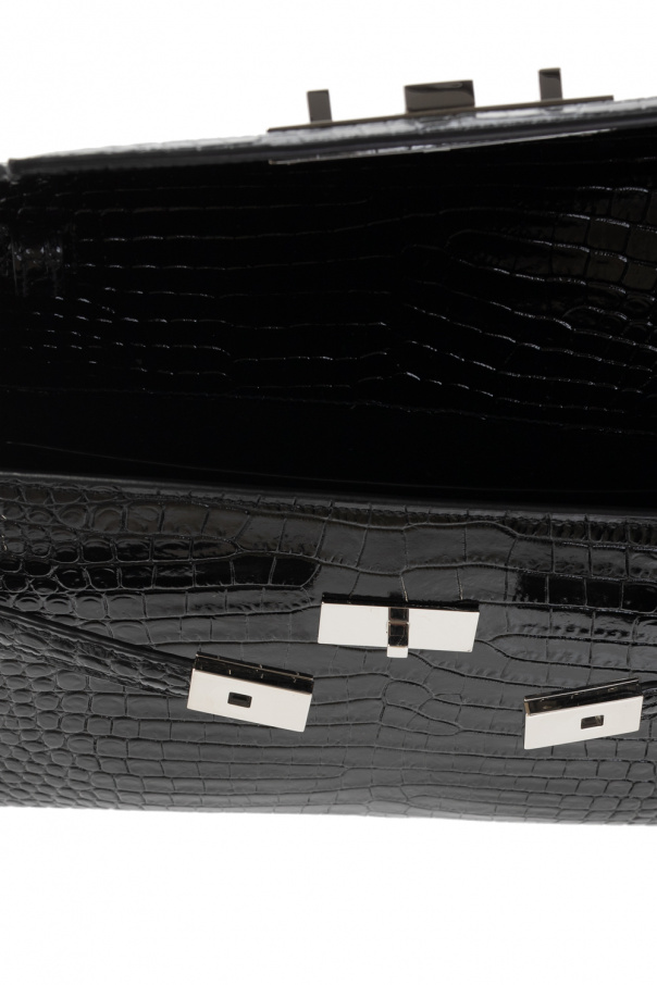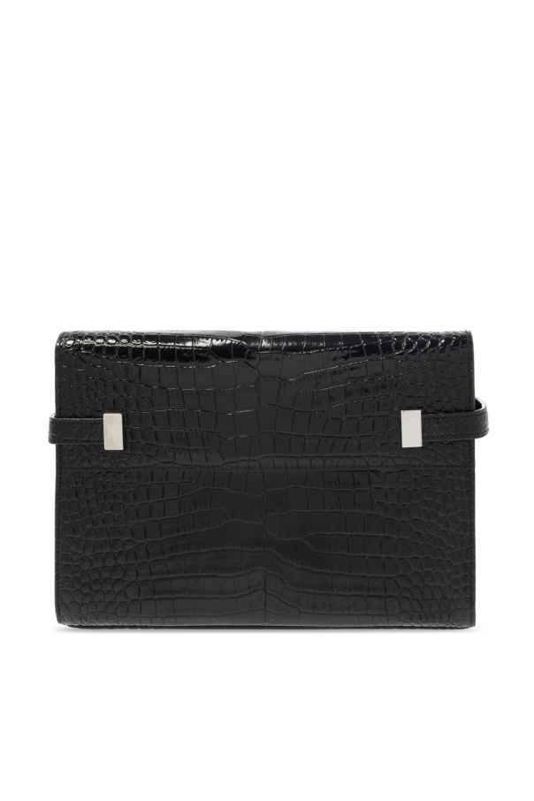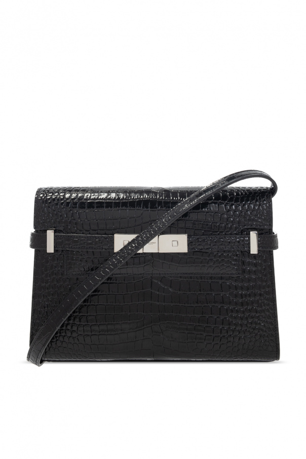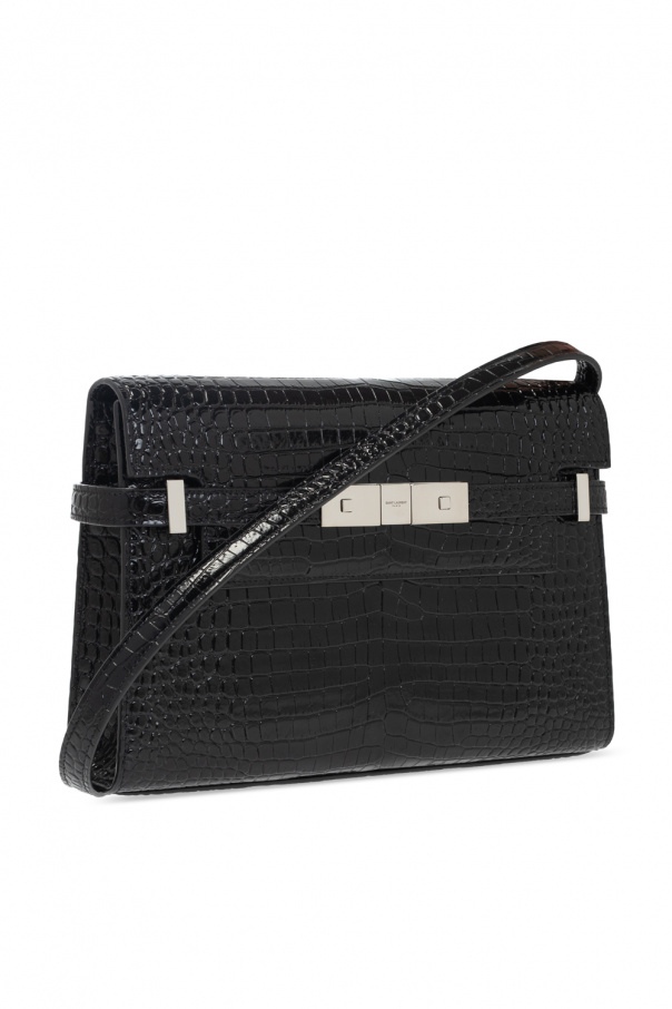 Black ‘Manhattan Small’ shoulder bag from Saint Laurent. Crafted from calf leather with a crocodile skin effect, this design features a distinctive fastener with an embossed logo, a detachable and adjustable shoulder strap, silver-tone metal hardware and one internal compartment with a slip pocket.