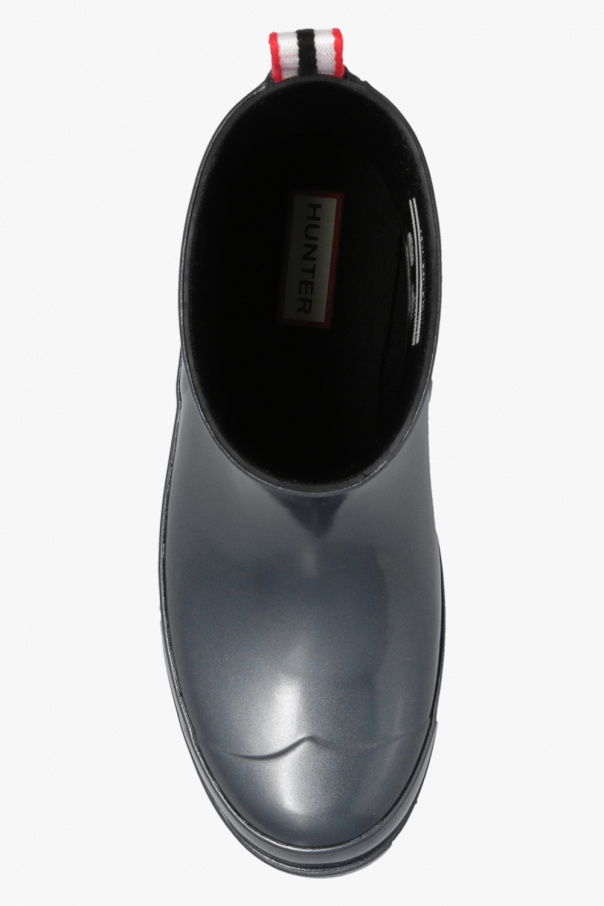 Dark silver-tone ‘Nebula Play Short’ rain boots from Hunter. Handcrafted from natural vulcanized rubber with an iridescent finish, this pair features a logo appliqué, fabric handle at the back in white, red and navy as well as rubber sole with Hunter Original tread pattern.