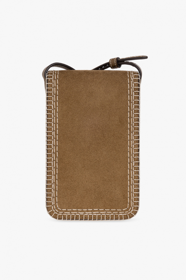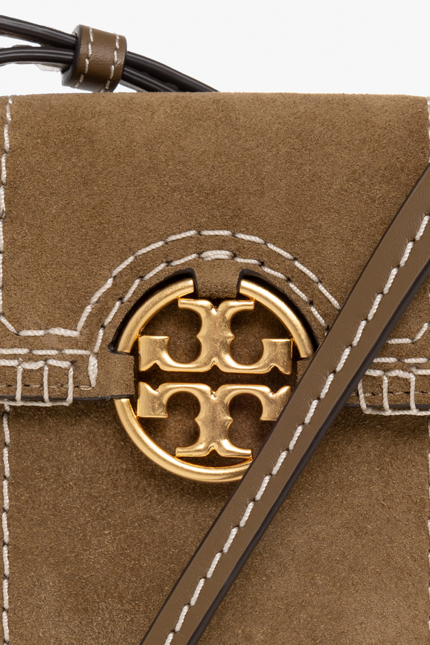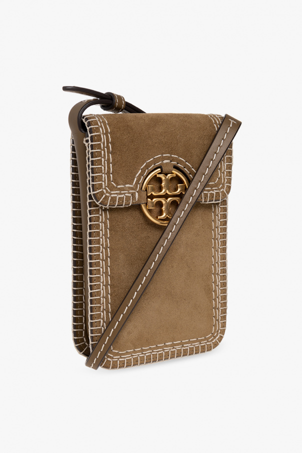 Khaki ‘Miller’ phone holder from Tory Burch. Made of suede with a leather trim, this design features magnetic snap closures, contrasting white stitching details, decorative gold-tone ‘Double T’ hardware on the front, an adjustable strap, gold-tone metal elements and one internal compartment with a card slot.