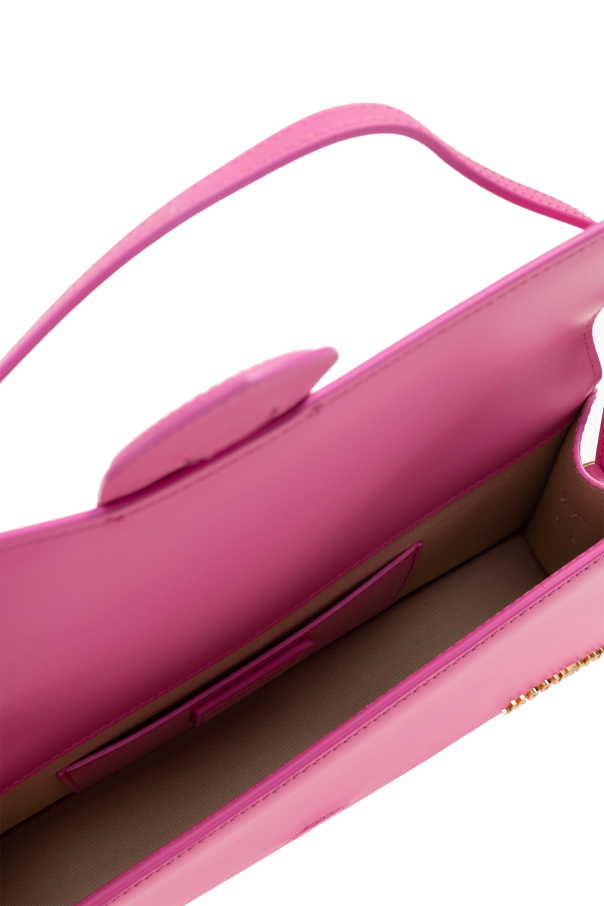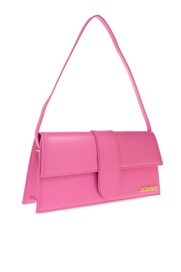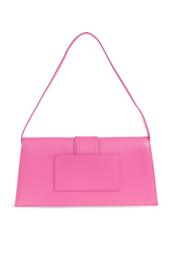Pink ‘Le Bambino Long’ shoulder bag from Jacquemus. Made of calf leather, this design secures with a magnetic fastener and showcases a logo-shaped application on the flap, one back slip pocket, gold-tone metal hardware as well as a detachable shoulder strap and one internal compartment with a card slot.