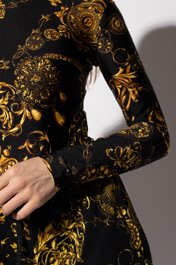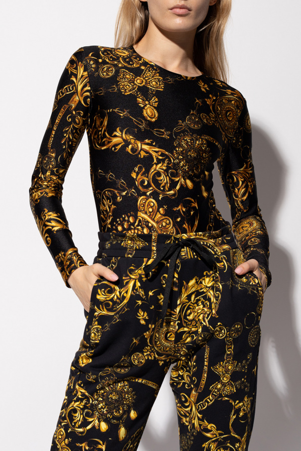 Black body with long sleeves from Versace Jeans Couture. Fastened with a zip and hooks, this round neck design is decorated with an orange print.