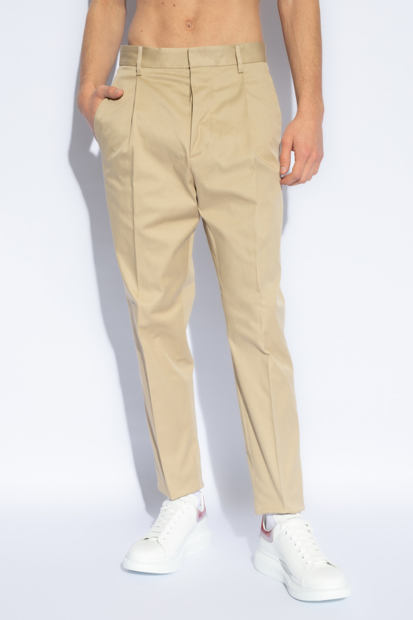 Beige ‘Cool Guy’ pleat-front trousers from Dsquared2. Made of cotton, this pair falls with tapered legs and features button fastenings, two slip pockets and two button pockets.
