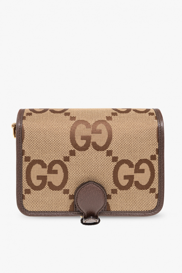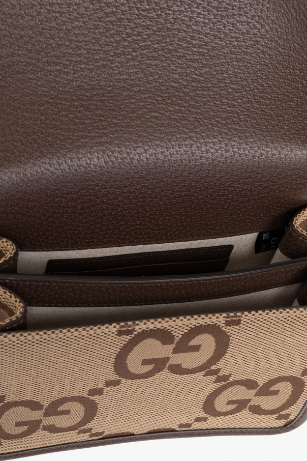 Beige and brown shoulder bag from Gucci. Made of the brand’s signature Jumbo GG canvas with leather trims, this model fastens with a magnetic snap and is complete with a detachable and adjustable shoulder strap with the green and red Web motif, gold-tone metal hardware and two separate internal compartments with two card slots.