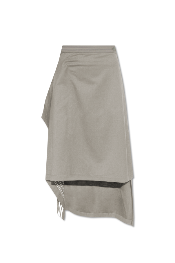 Grey skirt from Y-3 Yohji Yamamoto. Cut with an asymmetrical silhouette, this style showcases a printed logo, white three-stripe taping, one flapped pocket with a button and side slits.