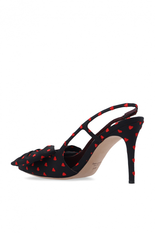 Black ‘Sheela’ pumps from Kate Spade. Crafted from taffeta embroidered with a red heart pattern, this pair features a buckled ankle strap, decorative bow appliqué, pointed toe, open back and beige leather sole.