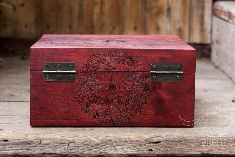 Дерево, рисунок - пирография (выжигание). Инкрустировано перламутром (сверху на крышке) и агатом (на передней панели). Обработано морилкой на водной основе и акриловым лаком также на водной основе дабы не было никаких специфических запахов после обработки. Размер 28х28х14 см. Полностью ручная работа.