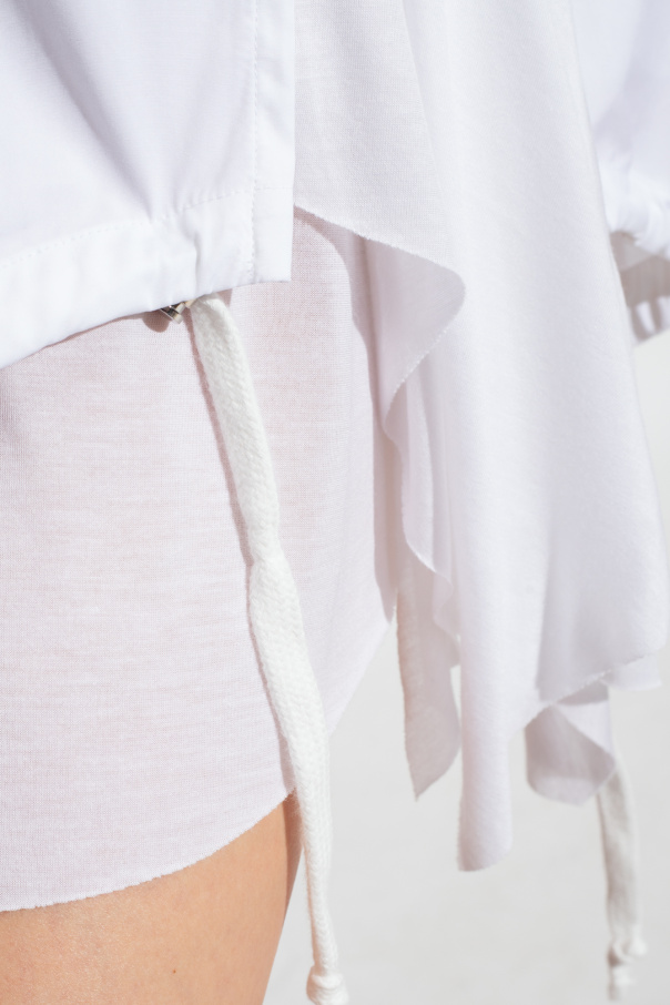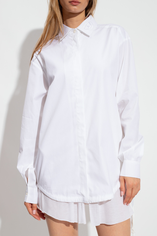 White ‘C-ENTEL’ shirt from Diesel. Crafted from contrasting fabrics, this design features buttons with a concealed placket, logo-embroidered collar, decorative hem with drawstrings on the sides and long sleeves with buttoned cuffs.
