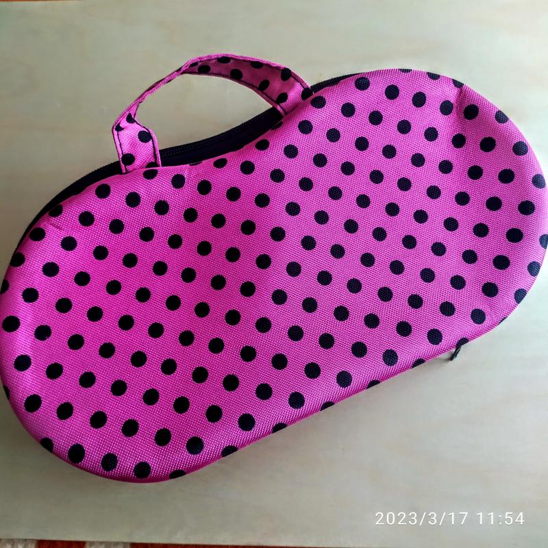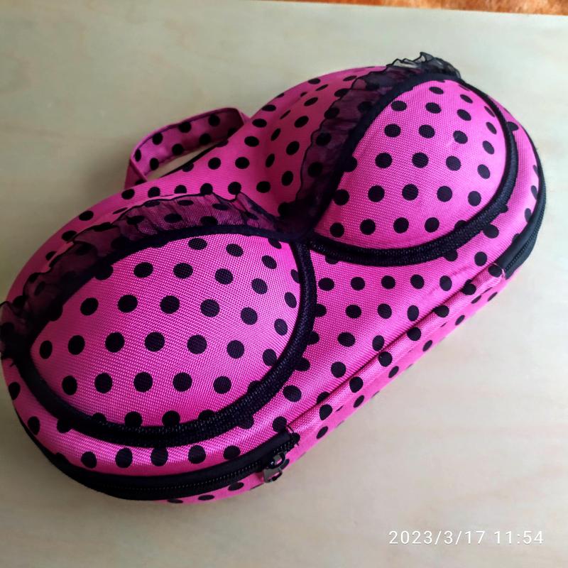 Чехол жесткий, литой, полностью повторяющий форму бюстгальтера, что не даст Вашему нижнему белью помыться при перевозке. Кроме того, сумочка, изготовленная из комбинации этилен-винил-ацетата, мультипандекса и нейлона, может стать оригинальным дополнением к интерьеру романтичной спальни. Сумочка имеет форму бюстгальтера и выполнена в розовом цвете, имеет удобную для переноски ручку, застежку-молнию по периметру и открывается на 180 градусов, позволяя сохранять бюстгальтеры любых размеров.