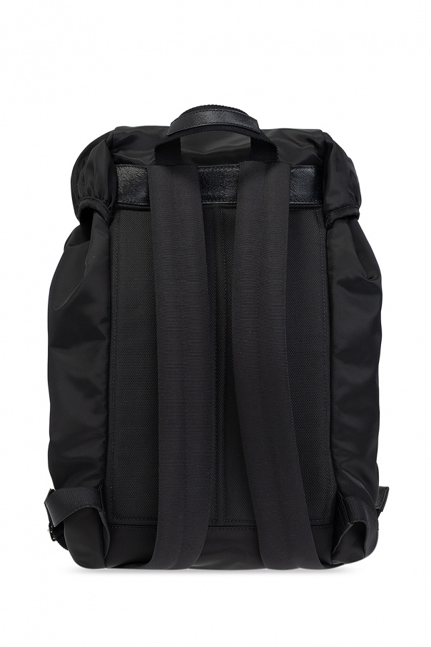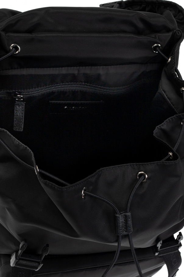 Black backpack from Givenchy. Fastened with snaps and drawstrings, this design features a logo appliqué, front zip pocket, half-round handle, adjustable shoulder strap, silver-tone metal hardware and one internal compartment with one zip pocket.