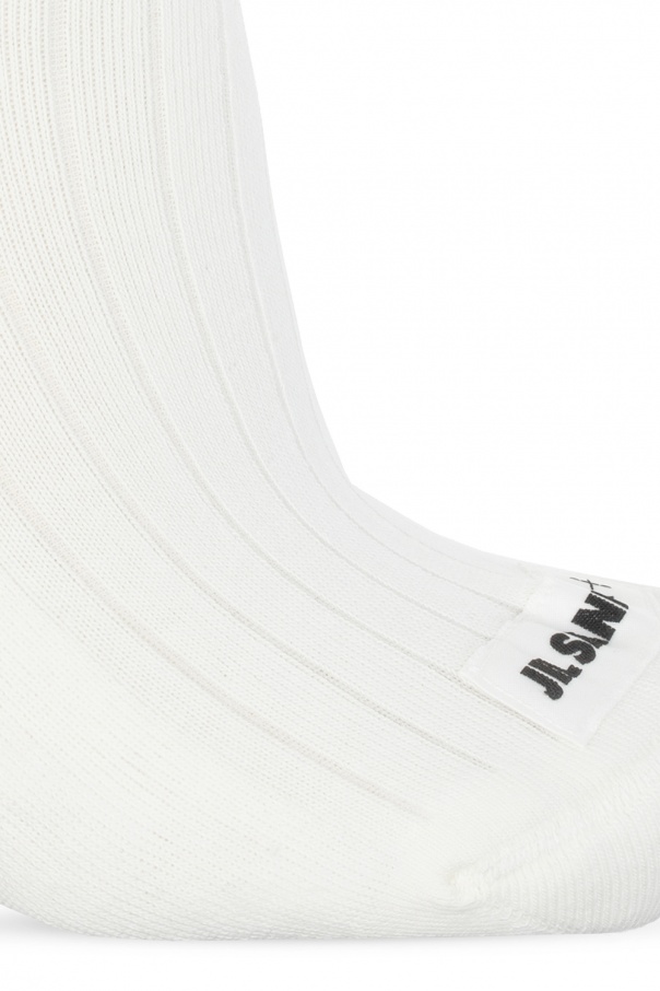 White ribbed socks from Jil Sander. Made of cotton, this design features a logo patch in black and an elasticated cuff.