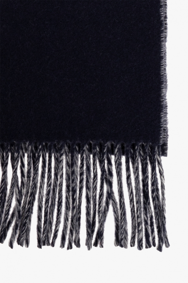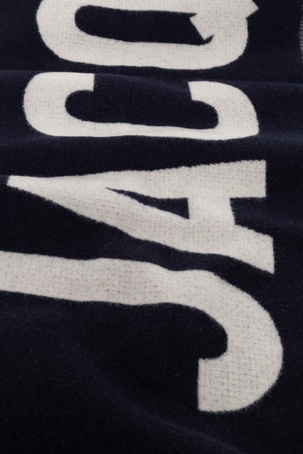 Navy blue scarf from Jacquemus. Made of wool, this item showcases an embroidered white logo and fringed edges.