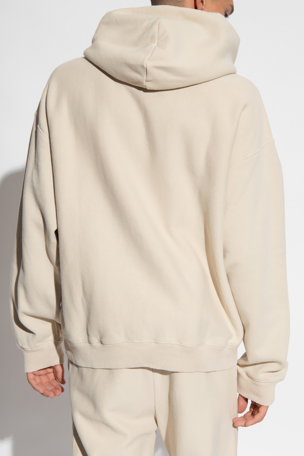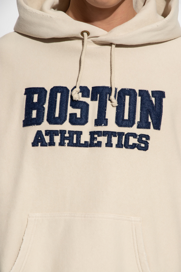 Beige hoodie from Champion. Made of cotton, this garment features a navy patch, vintage effect, drawstring hood, slip pocket and ribbed trims at the hem and cuffs.