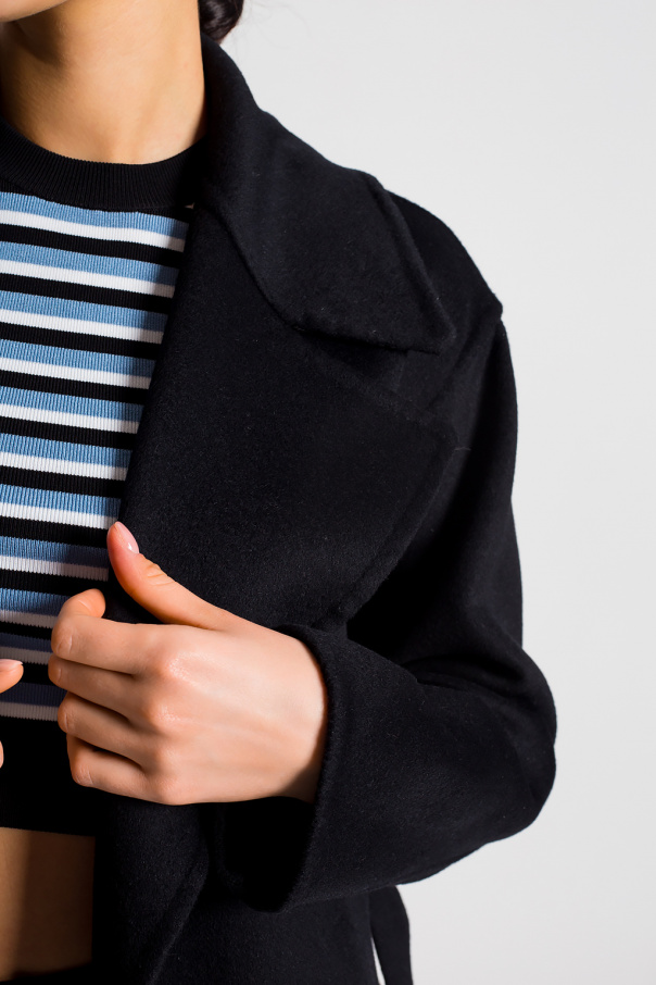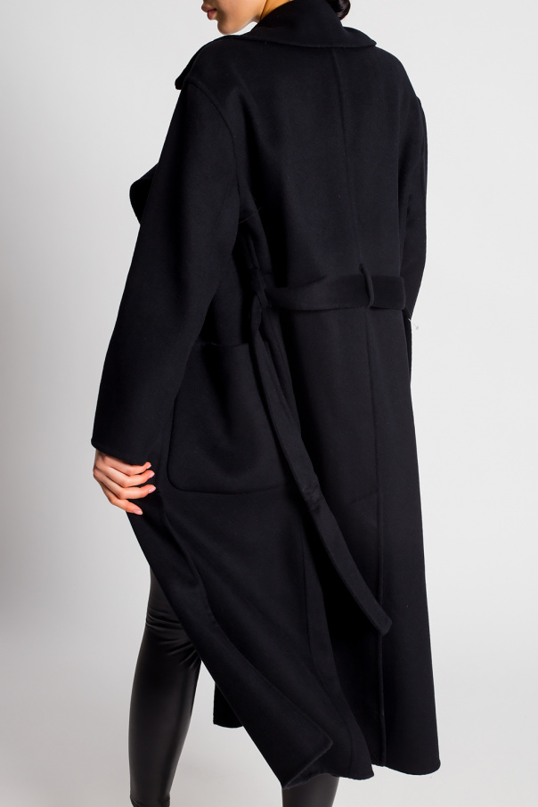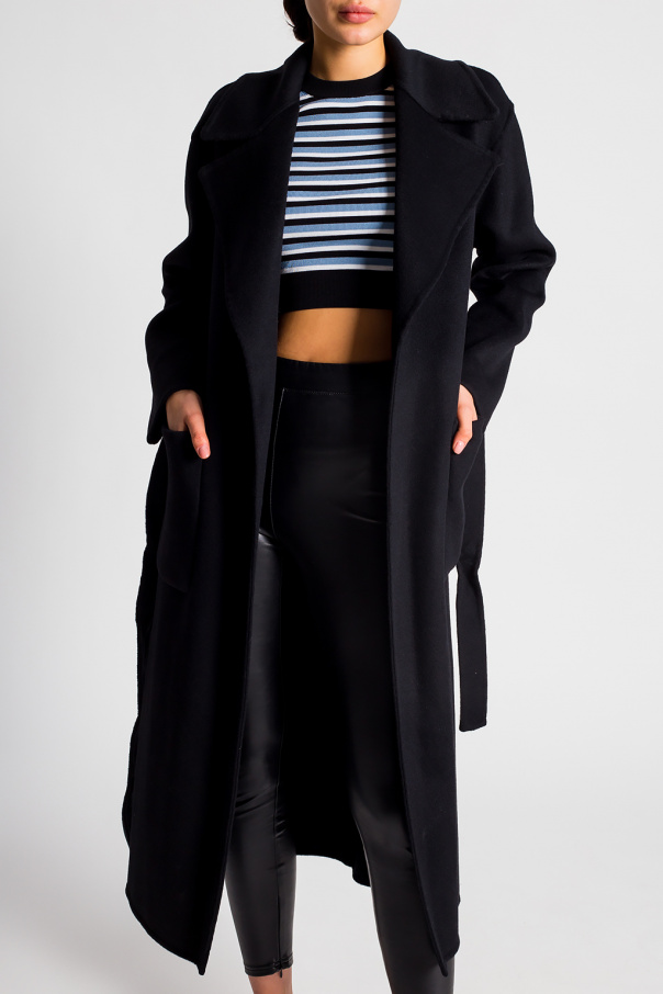 Black coat from Michael Michael Kors. Made of wool, this style features a waist-cinching belt, two slip pockets and a single back vent.